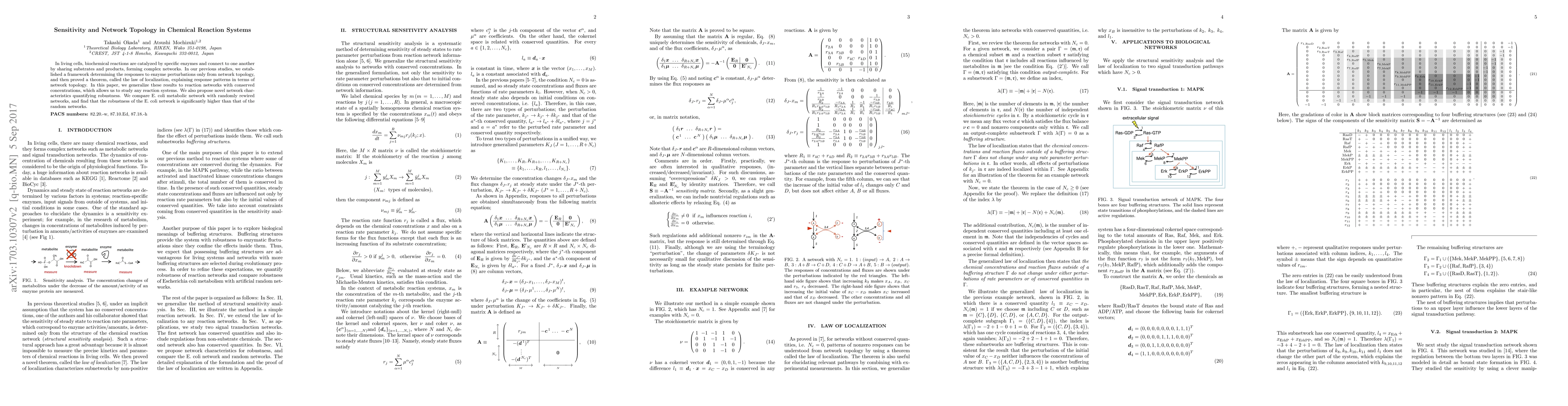 This paper investigates the sensitivity and network topology of chemical reaction systems in living cells, finding that the E. coli metabolic network is significantly more robust than randomly rewired networks.