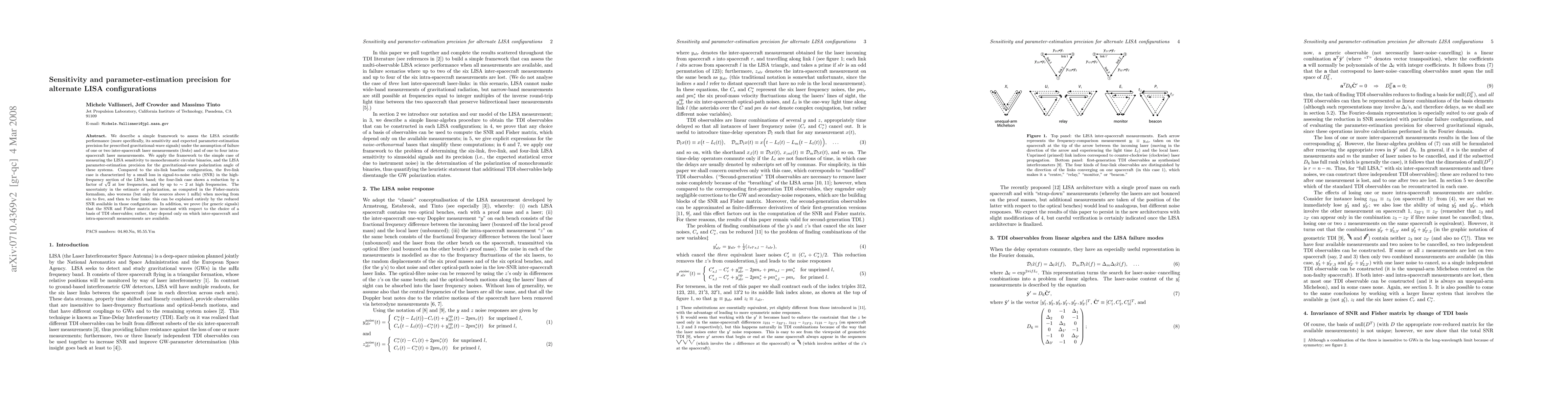 We describe a simple framework to assess the LISA scientific performance (more specifically, its sensitivity and expected parameter-estimation precision for prescribed gravitational-wave signals) under the assumption of failure of one or two inter-spacecraft laser measurements (links) and of one to four intra-spacecraft laser measurements. We apply the framework to the simple case of measuring the LISA sensitivity to monochromatic circular binaries, and the LISA parameter-estimation precision for the gravitational-wave polarization angle of these systems. Compared to the six-link baseline configuration, the five-link case is characterized by a small loss in signal-to-noise ratio (SNR) in the high-frequency section of the LISA band; the four-link case shows a reduction by a factor of sqrt(2) at low frequencies, and by up to ~2 at high frequencies. The uncertainty in the estimate of polarization, as computed in the Fisher-matrix formalism, also worsens when moving from six to five, and then to four links: this can be explained by the reduced SNR available in those configurations (except for observations shorter than three months, where five and six links do better than four even with the same SNR). In addition, we prove (for generic signals) that the SNR and Fisher matrix are invariant with respect to the choice of a basis of TDI observables; rather, they depend only on which inter-spacecraft and intra-spacecraft measurements are available.