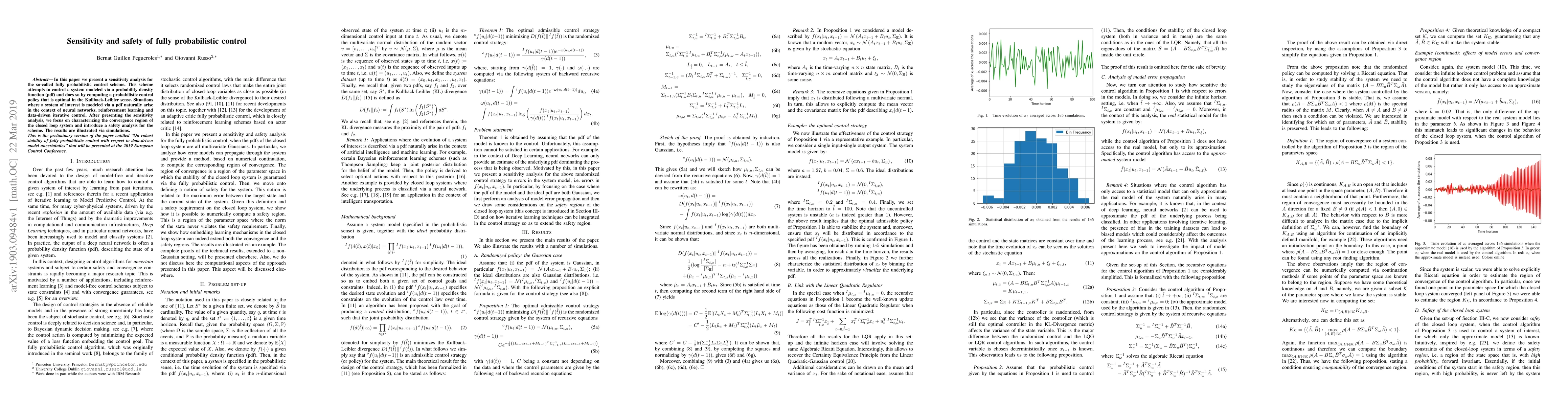 In this paper we present a sensitivity analysis for the so-called fully probabilistic control scheme. This scheme attempts to control a system modeled via a probability density function (pdf) and does so by computing a probabilistic control policy that is optimal in the Kullback-Leibler sense. Situations where a system of interest is modeled via a pdf naturally arise in the context of neural networks, reinforcement learning and data-driven iterative control. After presenting the sensitivity analysis, we focus on characterizing the convergence region of the closed loop system and introduce a safety analysis for the scheme. The results are illustrated via simulations. This is the preliminary version of the paper entitled "On robust stability of fully probabilistic control with respect to data-driven model uncertainties" that will be presented at the 2019 European Control Conference.
