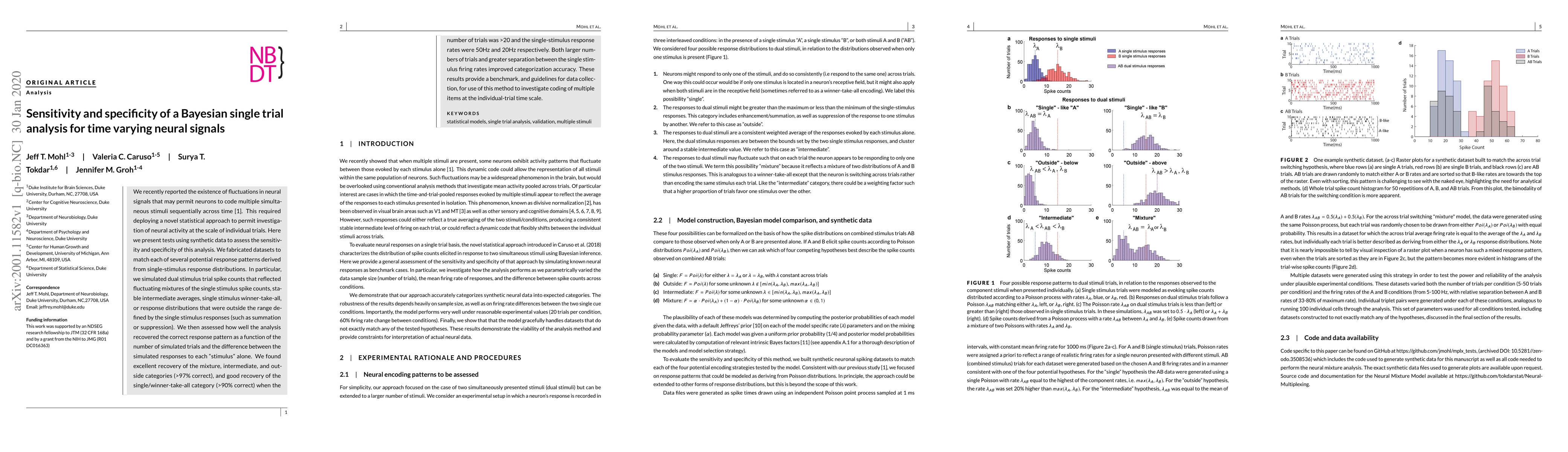 We recently reported the existence of fluctuations in neural signals that may permit neurons to code multiple simultaneous stimuli sequentially across time. This required deploying a novel statistical approach to permit investigation of neural activity at the scale of individual trials. Here we present tests using synthetic data to assess the sensitivity and specificity of this analysis. We fabricated datasets to match each of several potential response patterns derived from single-stimulus response distributions. In particular, we simulated dual stimulus trial spike counts that reflected fluctuating mixtures of the single stimulus spike counts, stable intermediate averages, single stimulus winner-take-all, or response distributions that were outside the range defined by the single stimulus responses (such as summation or suppression). We then assessed how well the analysis recovered the correct response pattern as a function of the number of simulated trials and the difference between the simulated responses to each "stimulus" alone. We found excellent recovery of the mixture, intermediate, and outside categories (>97% percent correct), and good recovery of the single/winner-take-all category (>90% correct) when the number of trials was >20 and the single-stimulus response rates were 50Hz and 20Hz respectively. Both larger numbers of trials and greater separation between the single stimulus firing rates improved categorization accuracy. These results provide a benchmark, and guidelines for data collection, for use of this method to investigate coding of multiple items at the individual-trial time scale.