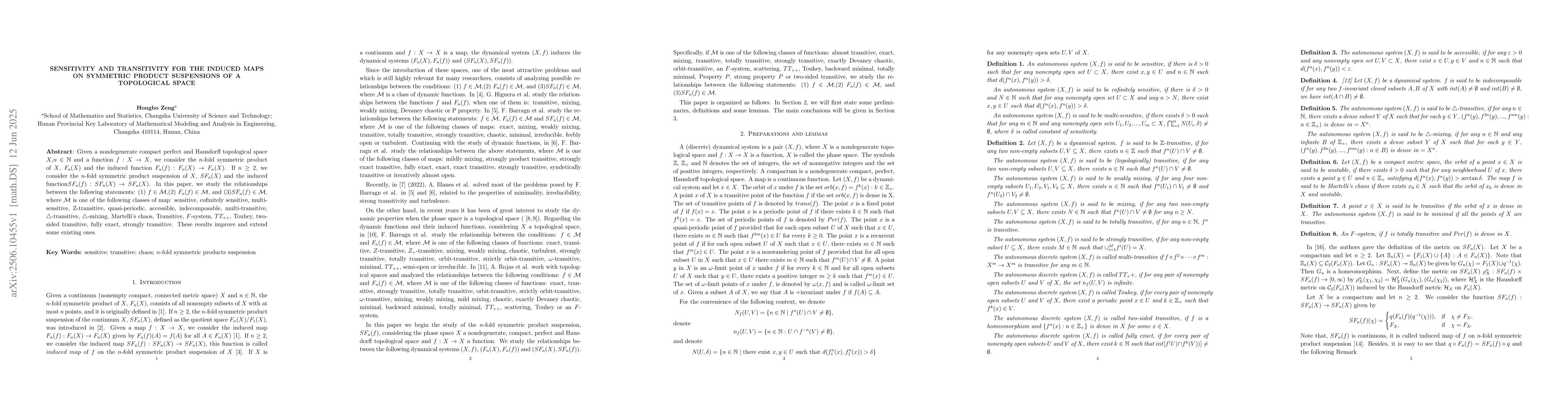 Given a nondegenerate compact perfect and Hausdorff topological space $X$,$n\in \mathbb{N}$ and a function $f:X\rightarrow X$, we consider the $n$-fold symmetric product of $X$, $F_n(X)$ and the induced function $F_n(f):F_n(X)\rightarrow F_n(X)$. If $n\geq2$, we consider the $n$-fold symmetric product suspension of $X$, $SF_n(X)$ and the induced function$SF_n(f):SF_n(X)\rightarrow SF_n(X)$. In this paper, we study the relationships between the following statements: (1) $f\in \mathcal{M}$,(2) $F_n(f)\in \mathcal{M}$, and (3)$SF_n(f)\in \mathcal{M}$, where $\mathcal{M}$ is one of the following classes of map: sensitive, cofinitely sensitive, multi-sensitive, Z-transitive, quasi-periodic, accessible, indecomposable, multi-transitive, $\bigtriangleup$-transitive, $\bigtriangleup$-mixing, Martelli's chaos, Transitive, $F$-system, $TT_{++}$, Touhey, two-sided transitive, fully exact, strongly transitive. These results improve and extend some existing ones.