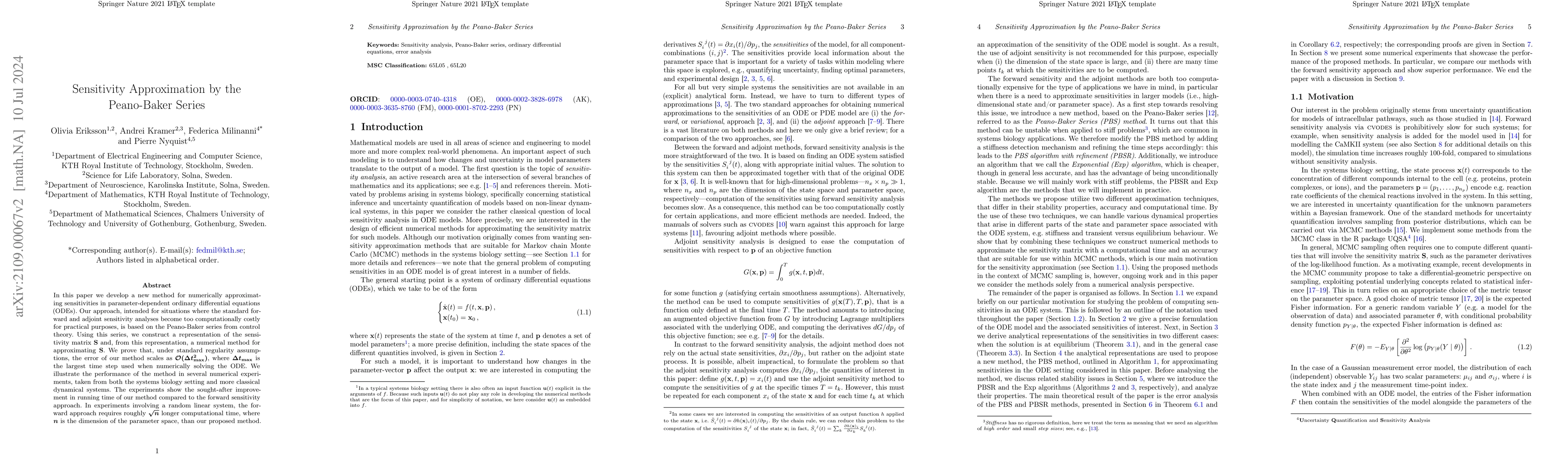 In this paper we develop a new method for numerically approximating sensitivities in parameter-dependent ordinary differential equations (ODEs). Our approach, intended for situations where the standard forward and adjoint sensitivity analysis become too computationally costly for practical purposes, is based on the Peano-Baker series from control theory. We give a representation, using this series, for the sensitivity matrix $\boldsymbol{S}$ of an ODE system and use the representation to construct a numerical method for approximating $\boldsymbol{S}$. We prove that, under standard regularity assumptions, the error of our method scales as $O(\Delta t ^2 _{max})$, where $\Delta t _{max}$ is the largest time step used when numerically solving the ODE. We illustrate the performance of the method in several numerical experiments, taken from both the systems biology setting and more classical dynamical systems. The experiments show the sought-after improvement in running time of our method compared to the forward sensitivity approach. For example, in experiments involving a random linear system, the forward approach requires roughly $\sqrt{n}$ longer computational time, where $n$ is the dimension of the parameter space, than our proposed method.