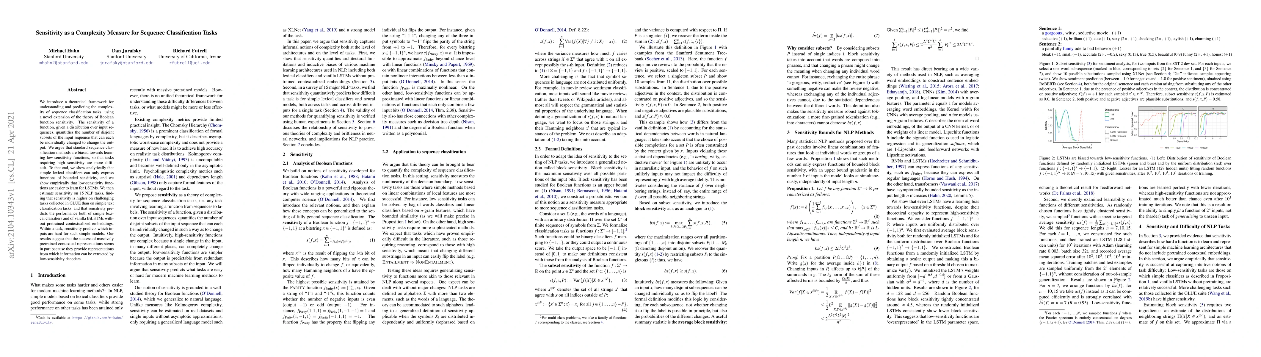 We introduce a theoretical framework for understanding and predicting the complexity of sequence classification tasks, using a novel extension of the theory of Boolean function sensitivity. The sensitivity of a function, given a distribution over input sequences, quantifies the number of disjoint subsets of the input sequence that can each be individually changed to change the output. We argue that standard sequence classification methods are biased towards learning low-sensitivity functions, so that tasks requiring high sensitivity are more difficult. To that end, we show analytically that simple lexical classifiers can only express functions of bounded sensitivity, and we show empirically that low-sensitivity functions are easier to learn for LSTMs. We then estimate sensitivity on 15 NLP tasks, finding that sensitivity is higher on challenging tasks collected in GLUE than on simple text classification tasks, and that sensitivity predicts the performance both of simple lexical classifiers and of vanilla BiLSTMs without pretrained contextualized embeddings. Within a task, sensitivity predicts which inputs are hard for such simple models. Our results suggest that the success of massively pretrained contextual representations stems in part because they provide representations from which information can be extracted by low-sensitivity decoders.
