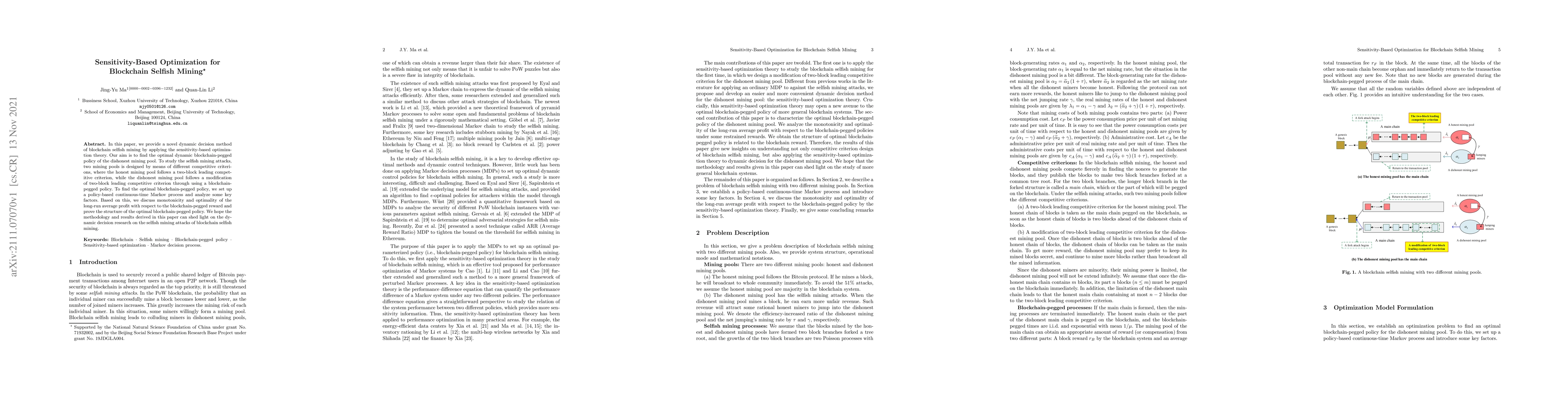 The paper applies sensitivity-based optimization theory to develop a dynamic decision method for blockchain selfish mining, modeling it with a policy-based continuous-time Markov process.