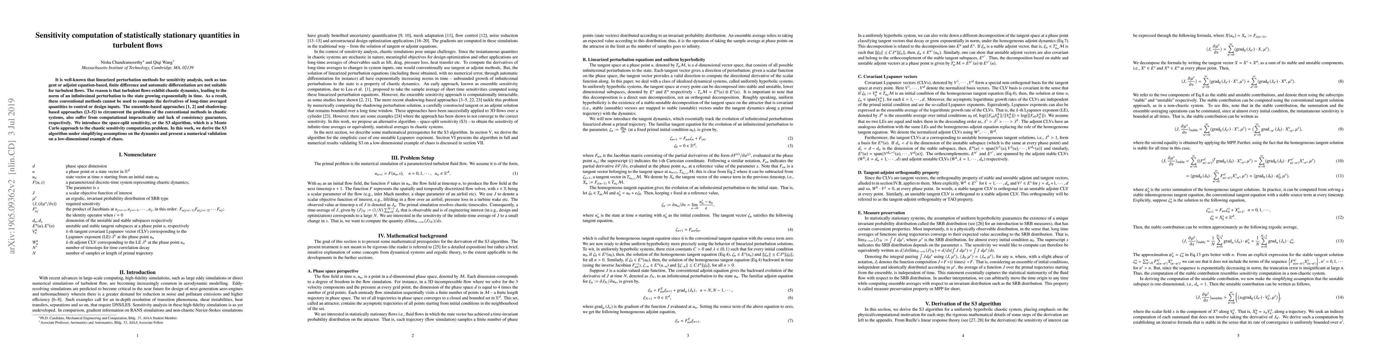 It is well-known that linearized perturbation methods for sensitivity analysis, such as tangent or adjoint equation-based, finite difference and automatic differentiation are not suitable for turbulent flows. The reason is that turbulent flows exhibit chaotic dynamics, leading to the norm of an infinitesimal perturbation to the state growing exponentially in time. As a result, these conventional methods cannot be used to compute the derivatives of long-time averaged quantities to control or design inputs. The ensemble-based approaches and shadowing-based approaches to circumvent the problems of the conventional methods in chaotic systems, also suffer from computational impracticality and lack of consistency guarantees, respectively. We introduce the space-split sensitivity, or the S3 algorithm, which is a Monte-Carlo approach to the chaotic sensitivity computation problem. In this work, we derive the S3 algorithm under simplifying assumptions on the dynamics and present a numerical validation on a low-dimensional example of chaos.