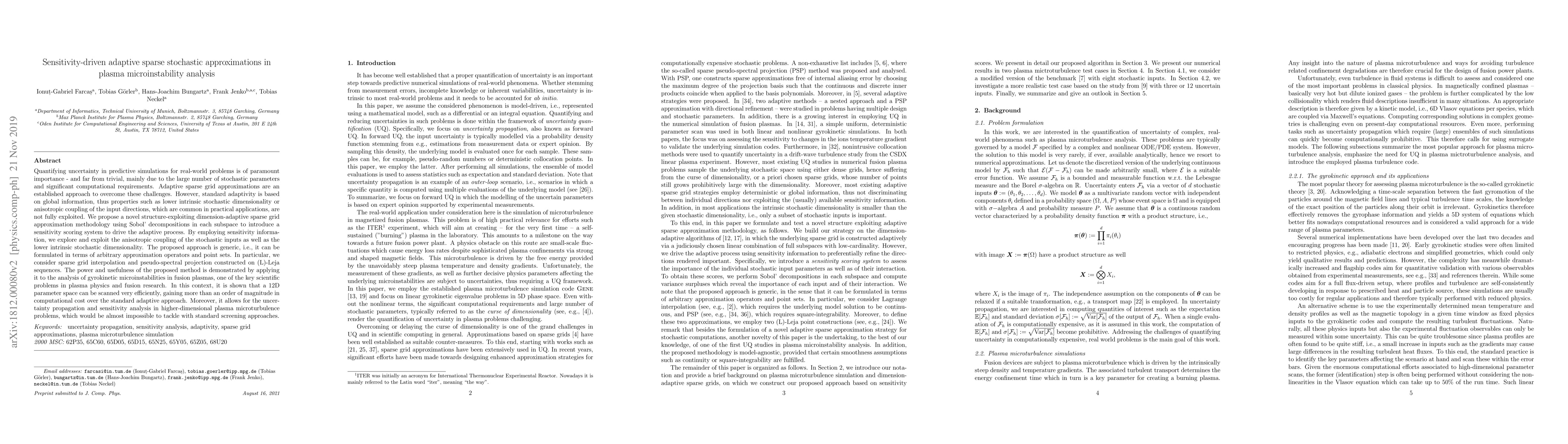 Quantifying uncertainty in predictive simulations for real-world problems is of paramount importance - and far from trivial, mainly due to the large number of stochastic parameters and significant computational requirements. Adaptive sparse grid approximations are an established approach to overcome these challenges. However, standard adaptivity is based on global information, thus properties such as lower intrinsic stochastic dimensionality or anisotropic coupling of the input directions, which are common in practical applications, are not fully exploited. We propose a novel structure-exploiting dimension-adaptive sparse grid approximation methodology using Sobol' decompositions in each subspace to introduce a sensitivity scoring system to drive the adaptive process. By employing local sensitivity information, we explore and exploit the anisotropic coupling of the stochastic inputs as well as the lower intrinsic stochastic dimensionality. The proposed approach is generic, i.e., it can be formulated in terms of arbitrary approximation operators and point sets. In particular, we consider sparse grid interpolation and pseudo-spectral projection constructed on (L)-Leja sequences. The power and usefulness of the proposed method is demonstrated by applying it to the analysis of gyrokinetic microinstabilities in fusion plasmas, one of the key scientific problems in plasma physics and fusion research. In this context, it is shown that a 12D parameter space can be scanned very efficiently, gaining more than an order of magnitude in computational cost over the standard adaptive approach. Moreover, it allows for the uncertainty propagation and sensitivity analysis in higher-dimensional plasma microturbulence problems, which would be almost impossible to tackle with standard screening approaches.
