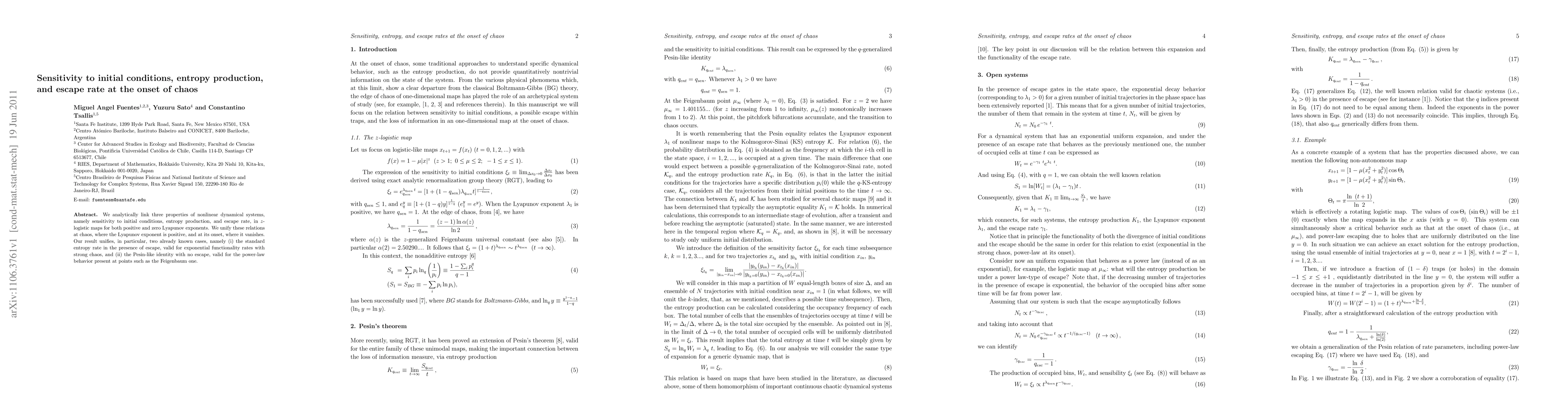 This paper analytically connects sensitivity to initial conditions, entropy production, and escape rates in nonlinear dynamical systems, particularly in $z$-logistic maps. It unifies these relations at the onset of chaos, providing a comprehensive view that encompasses both chaotic and non-chaotic regimes.