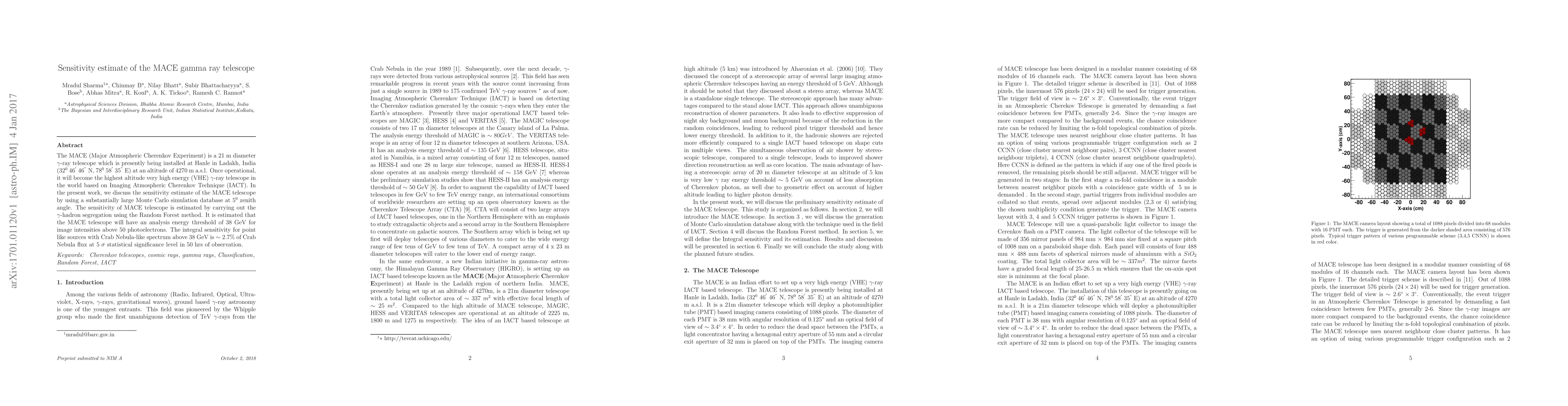 The MACE telescope, set to become the highest altitude VHE gamma-ray telescope, estimates a sensitivity threshold of 38 GeV and an integral sensitivity of ~2.7% of Crab Nebula flux at 5 sigma significance in 50 hours, using Monte Carlo simulations and Random Forest method for gamma-hadron discrimination.