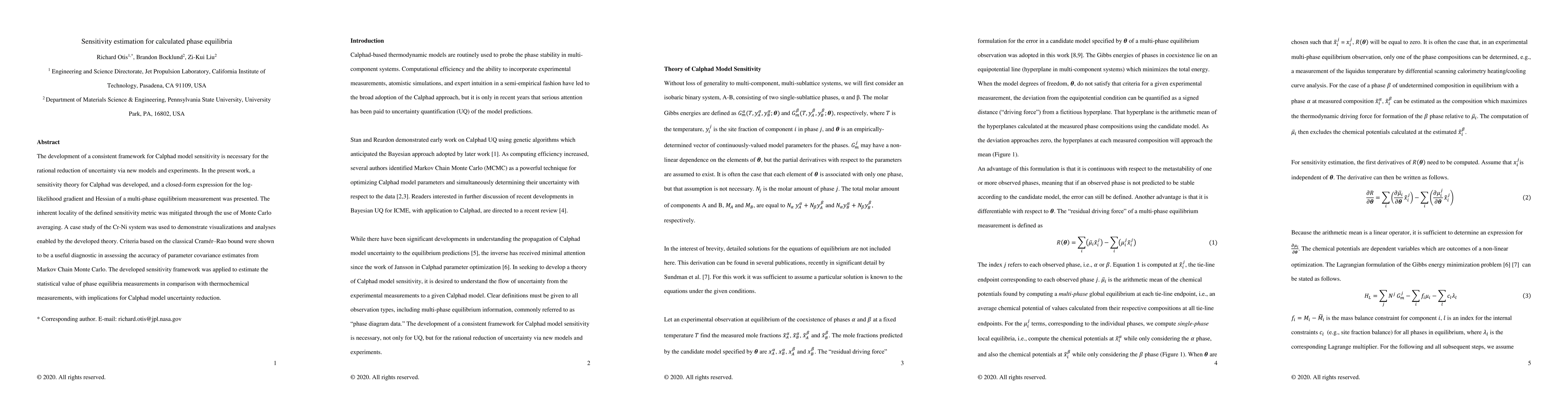This research presents a sensitivity theory for the Calphad model, providing a closed-form expression for log-likelihood gradient and Hessian of multi-phase equilibrium measurements. The study mitigates locality issues using Monte Carlo averaging and applies the framework to the Cr-Ni system, demonstrating its utility in assessing parameter covariance estimates and estimating the statistical value of phase equilibria measurements.