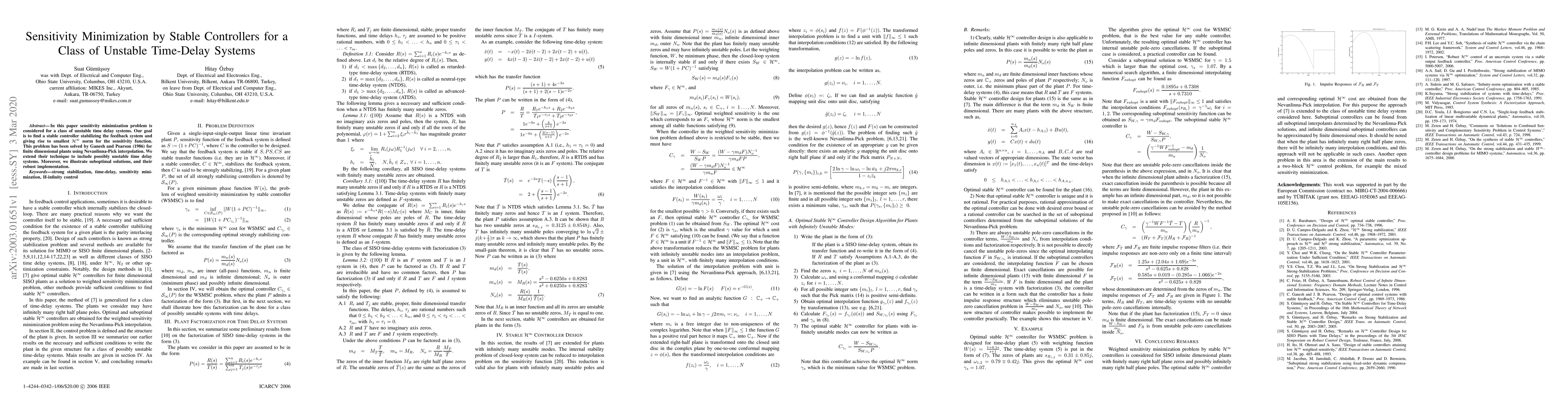In this paper sensitivity minimization problem is considered for a class of unstable time delay systems. Our goal is to find a stable controller stabilizing the feedback system and giving rise to smallest H-infinity norm for the sensitivity function. This problem has been solved by Ganesh and Pearson (1986) for finite dimensional plants using Nevanlinna-Pick interpolation. We extend their technique to include possibly unstable time delay systems. Moreover, we illustrate suboptimal solutions, and their robust implementation.