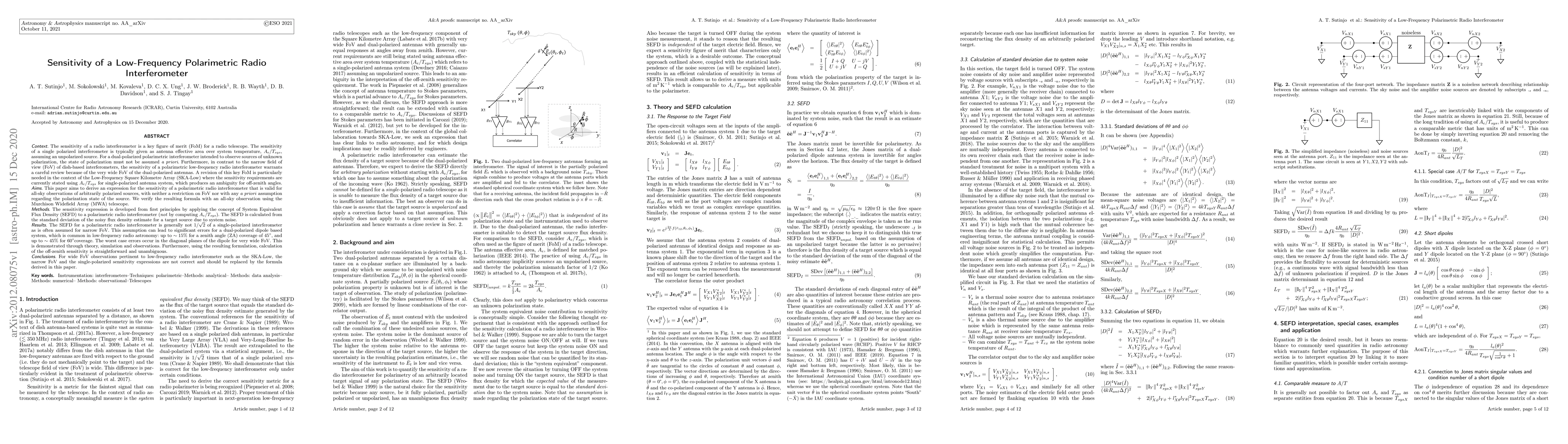 Aims: This paper aims to derive an expression for the sensitivity of a polarimetric radio interferometer that is valid for all-sky observations of arbitrarily polarized sources, with neither a restriction on FoV nor with any a priori assumption regarding the polarization state of the source. We verify the resulting formula with an all-sky observation using the Murchison Widefield Array (MWA) telescope. Methods: The sensitivity expression is developed from first principles by applying the concept of System Equivalent Flux Density (SEFD) to a polarimetric radio interferometer not by computing $A_e/T_{sys}$. The SEFD is calculated from the standard deviation of the noisy flux density estimate for a target source due to system noise. Results: The SEFD for a polarimetric radio interferometer is generally not $1/\sqrt{2}$ of a single-polarized interferometer as is often assumed for narrow FoV. This assumption can lead to significant errors for a dual-polarized dipole based system, which is common in low-frequency radio astronomy: up to $\sim 15\%$ for a zenith angle (ZA) coverage of $45^\circ$, and up to $\sim45\%$ for $60^\circ$ coverage. The worst case errors occur in the diagonal planes of the dipole for very wide FoV. This is demonstrated through theory, simulation and observations. Furthermore, using the resulting formulation, calculation of the off-zenith sensitivity is straightforward and unambiguous. Conclusions: For wide FoV observations pertinent to low-frequency radio interferometer such as the SKA-Low, the narrow FoV and the single-polarized sensitivity expressions are not correct and should be replaced by the formula derived in this paper.