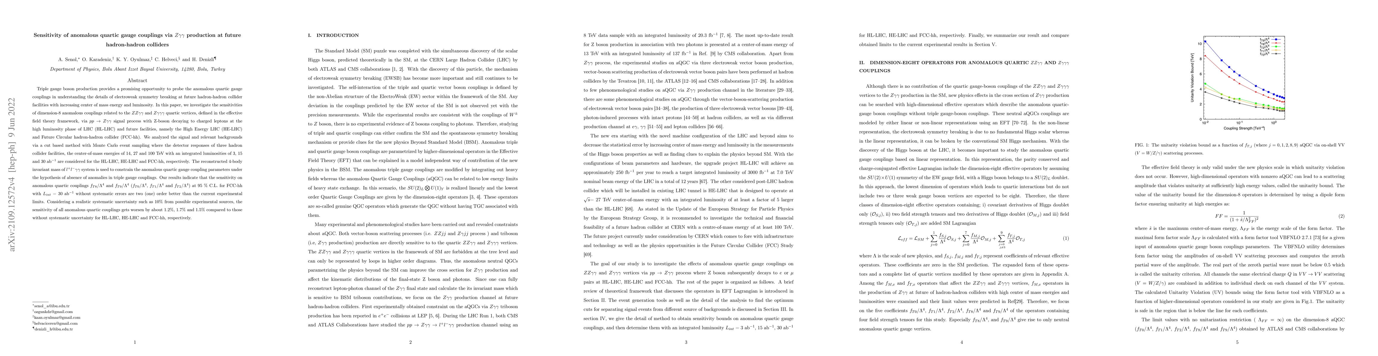 This paper investigates the sensitivity of anomalous quartic gauge couplings via $Z\gamma\gamma$ production at future hadron-hadron colliders, including the HL-LHC, HE-LHC, and FCC-hh. Results show that FCC-hh can significantly improve current experimental limits by two orders of magnitude, though systematic uncertainties reduce this sensitivity by about 1.5%.