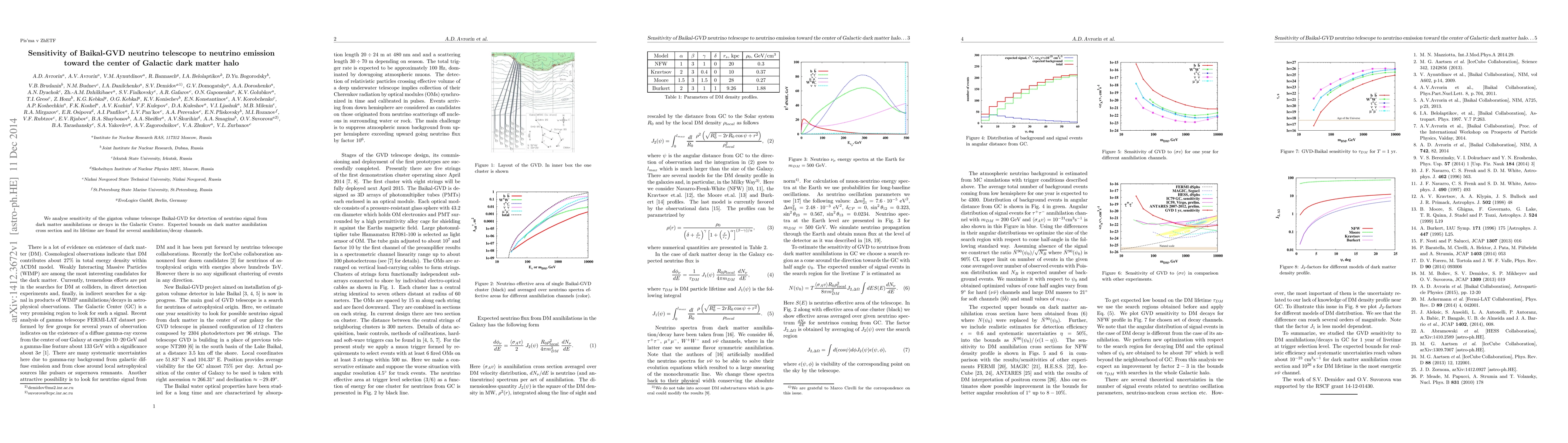 The Baikal-GVD neutrino telescope's sensitivity to neutrino emissions from dark matter annihilations or decays in the Galactic Center is analyzed, providing expected limits on dark matter annihilation cross-section and lifetime for various channels.