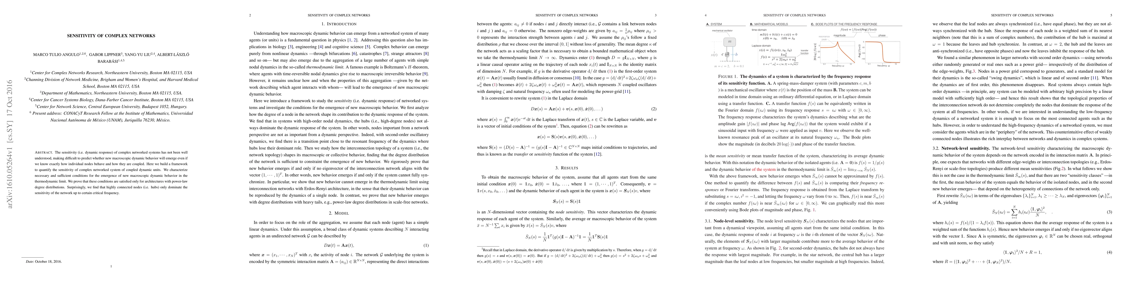 A new framework quantifies sensitivity in complex networks, finding that power-law degree distributions are necessary for emergence of macroscopic behavior. Highly connected nodes dominate sensitivity up to a critical frequency.