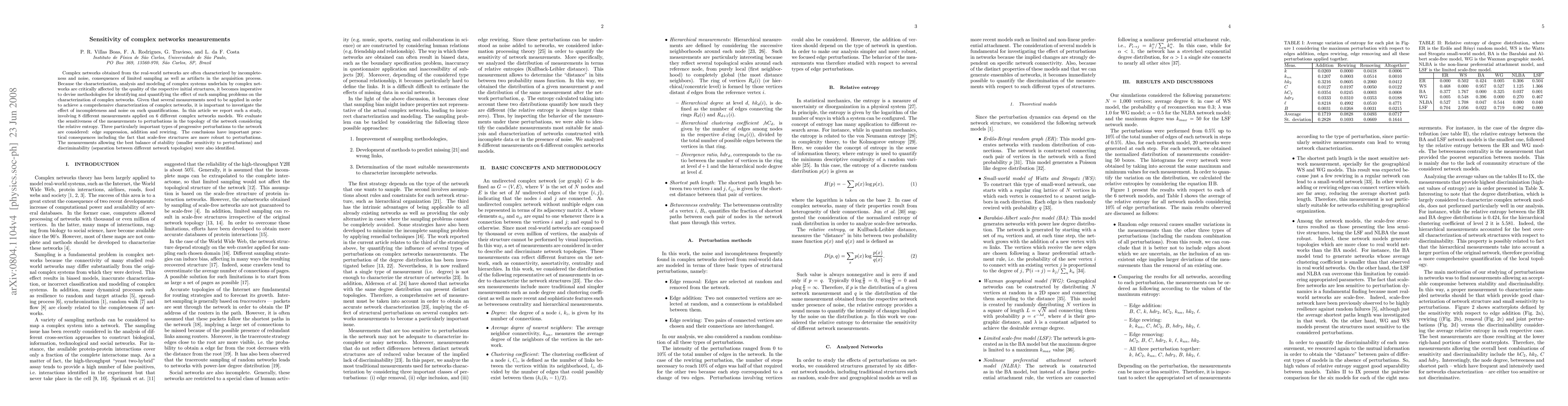 This study investigates how different measurements of complex networks are affected by sampling errors and noise in real-world networks. It finds that scale-free structures are more robust to perturbations and identifies the most sensitive measurements for analysis.