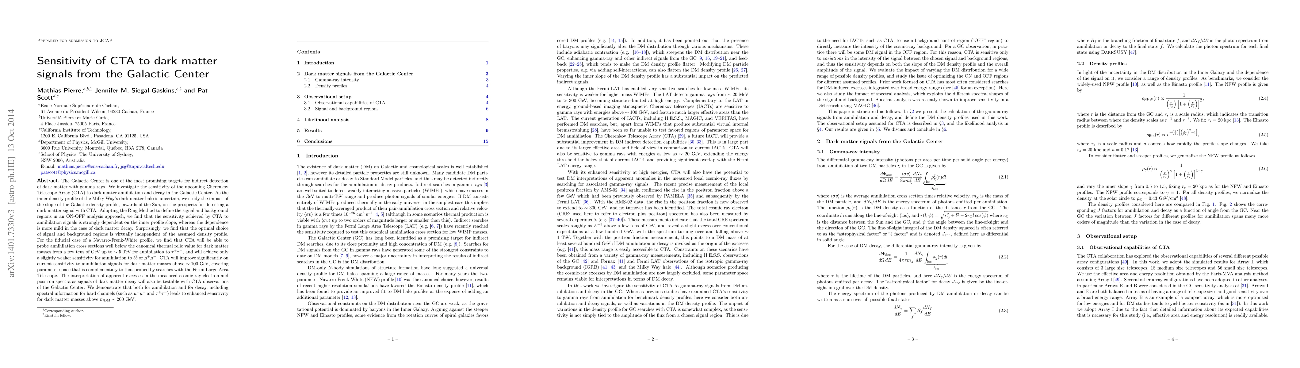 The Cherenkov Telescope Array (CTA) is highly sensitive to dark matter signals from the Galactic Center, with detection prospects strongly dependent on the dark matter density profile. CTA will significantly improve sensitivity to dark matter annihilation, especially for masses above 100 GeV, and will also test dark matter decay signals, particularly for masses above 200 GeV.