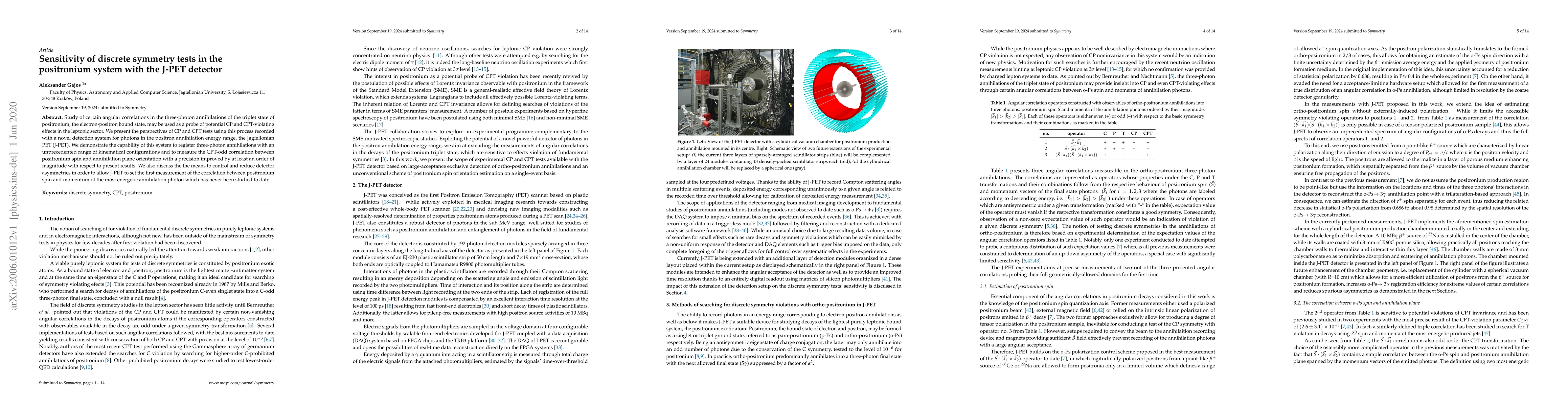 Study of certain angular correlations in the three-photon annihilations of the triplet state of positronium, the electron-positron bound state, may be used as a probe of potential CP and CPT-violating effects in the leptonic sector. We present the perspectives of CP and CPT tests using this process recorded with a novel detection system for photons in the positron annihilation energy range, the Jagiellonian PET (J-PET). We demonstrate the capability of this system to register three-photon annihilations with an unprecedented range of kinematical configurations and to measure the CPT-odd correlation between positronium spin and annihilation plane orientation with a precision improved by at least an order of magnitude with respect to present results. We also discuss the the means to control and reduce detector asymmetries in order to allow J-PET to set the first measurement of the correlation between positronium spin and momentum of the most energetic annihilation photon which has never been studied to date.