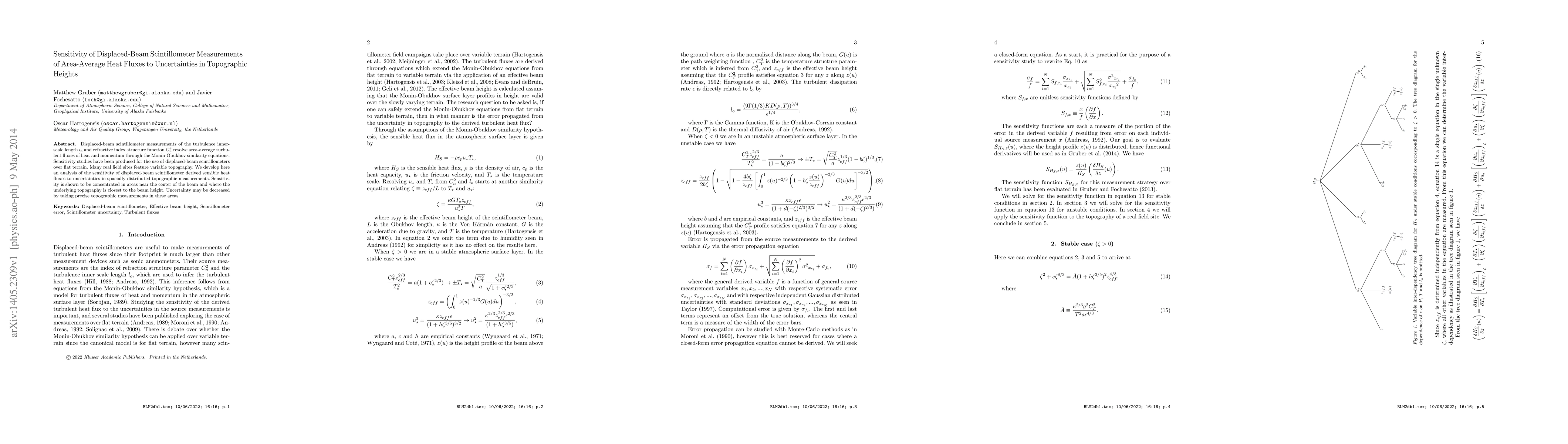 This paper investigates how uncertainties in spatially distributed topographic height measurements affect displaced-beam scintillometer-derived sensible heat fluxes. It finds that sensitivity is highest near the beam's center and in regions where topography is close to the beam height, suggesting improved precision in these areas can reduce uncertainty.