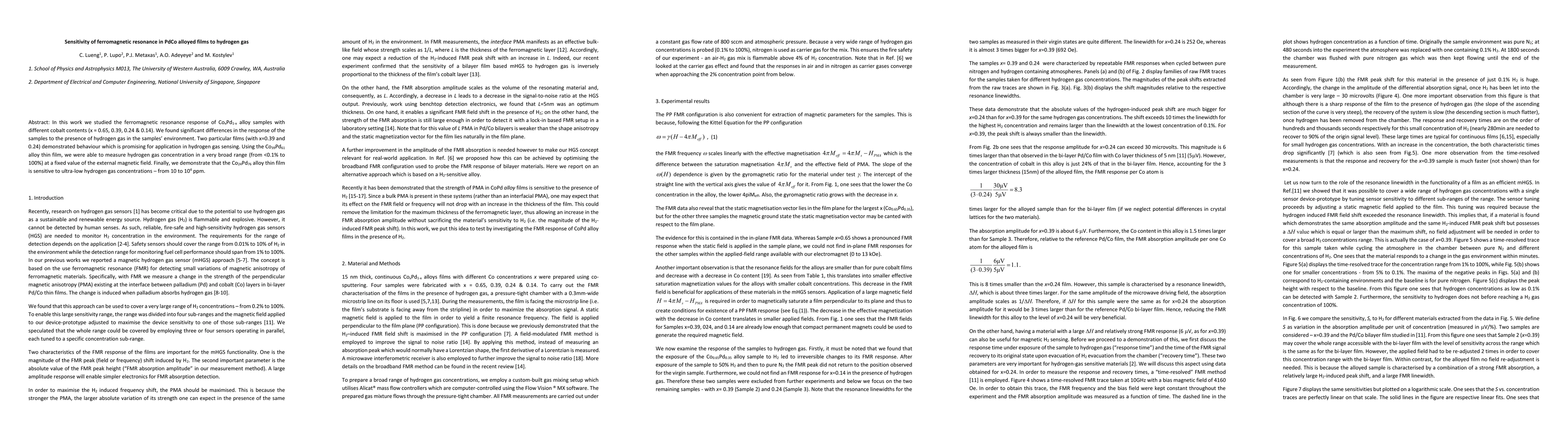 This study investigates the ferromagnetic resonance response of PdCo alloy films with varying cobalt content, revealing significant differences in hydrogen gas sensitivity. The Co(39)Pd(61) alloy shows promise for broad hydrogen gas sensing, while the Co(24)Pd(76) alloy is sensitive to ultra-low concentrations, from 10 to 10,000 ppm.