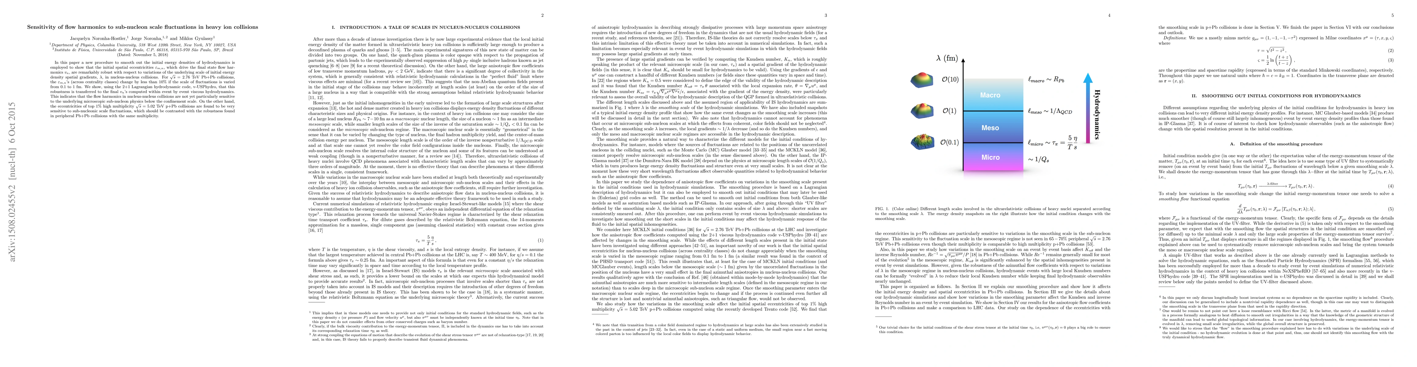 In this paper a new procedure to smooth out the initial energy densities of hydrodynamics is employed to show that the initial spatial eccentricities $\varepsilon_{m,n}$, which drive the final state flow harmonics $v_n$, are remarkably robust with respect to variations of the underlying scale of initial energy density spatial gradients, $\lambda$, in nucleus-nucleus collisions. For $\sqrt{s}=2.76$ TeV Pb+Pb collisions, the $\varepsilon_{m,n}$'s (across centrality classes) change by less than $10\%$ if the scale of fluctuations is varied from $0.1$ to $1$ fm. We show, using the 2+1 Lagrangian hydrodynamic code, v-USPhydro, that this robustness is transferred to the final $v_n$'s computed within event by event viscous hydrodynamics. This indicates that the flow harmonics in nucleus-nucleus collisions are not yet particularly sensitive to the underlying microscopic sub-nucleon physics below the confinement scale. On the other hand, the eccentricities of top $1\%$ high multiplicity $\sqrt{s}=5.02$ TeV p+Pb collisions are found to be very sensitive to sub-nucleonic scale fluctuations, which should be contrasted with the robustness found in peripheral Pb+Pb collisions with the same multiplicity.