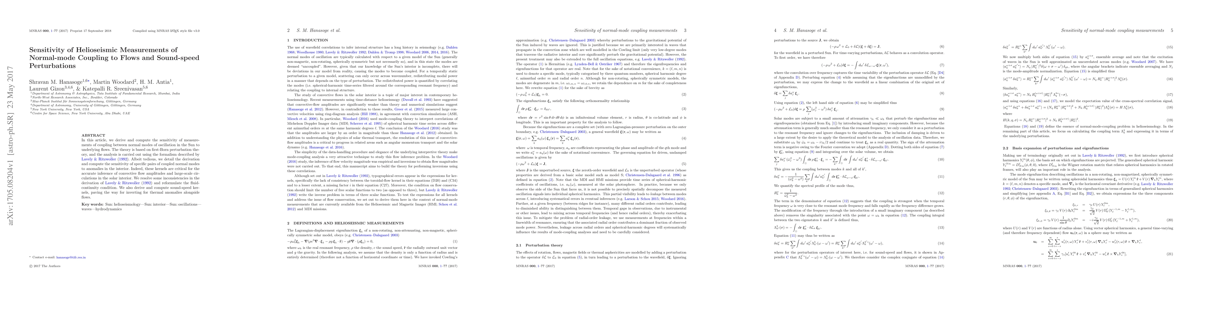 In this article, we derive and compute the sensitivity of measurements of coupling between normal modes of oscillation in the Sun to underlying flows. The theory is based on first-Born perturbation theory, and the analysis is carried out using the formalism described by \citet{lavely92}. Albeit tedious, we detail the derivation and compute the sensitivity of specific pairs of coupled normal modes to anomalies in the interior. Indeed, these kernels are critical for the accurate inference of convective flow amplitudes and large-scale circulations in the solar interior. We resolve some inconsistencies in the derivation of \citet{lavely92} and reformulate the fluid-continuity condition. We also derive and compute sound-speed kernels, paving the way for inverting for thermal anomalies alongside flows.