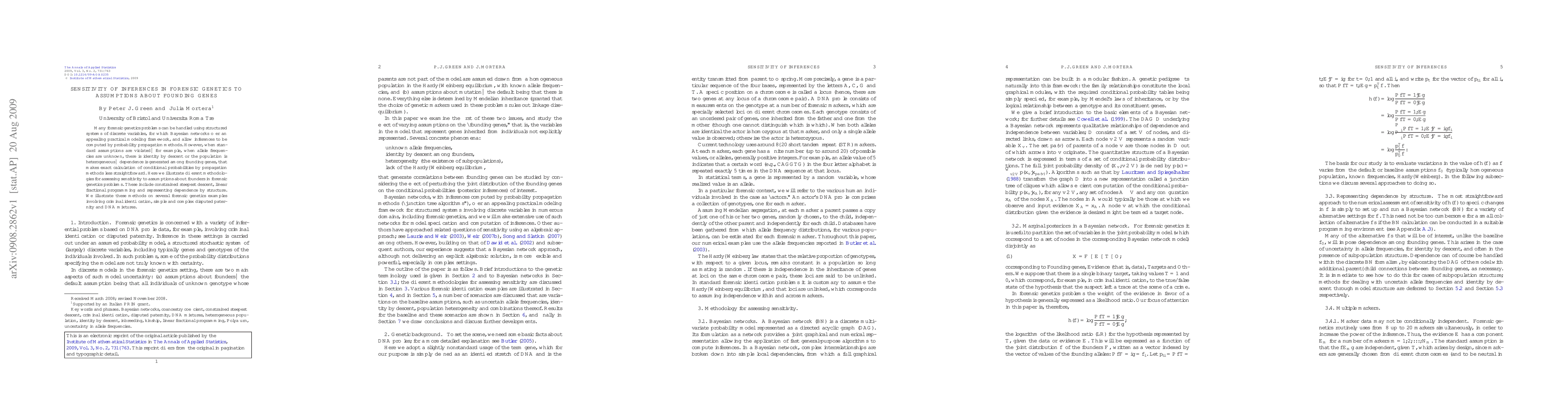 Many forensic genetics problems can be handled using structured systems of discrete variables, for which Bayesian networks offer an appealing practical modeling framework, and allow inferences to be computed by probability propagation methods. However, when standard assumptions are violated--for example, when allele frequencies are unknown, there is identity by descent or the population is heterogeneous--dependence is generated among founding genes, that makes exact calculation of conditional probabilities by propagation methods less straightforward. Here we illustrate different methodologies for assessing sensitivity to assumptions about founders in forensic genetics problems. These include constrained steepest descent, linear fractional programming and representing dependence by structure. We illustrate these methods on several forensic genetics examples involving criminal identification, simple and complex disputed paternity and DNA mixtures.