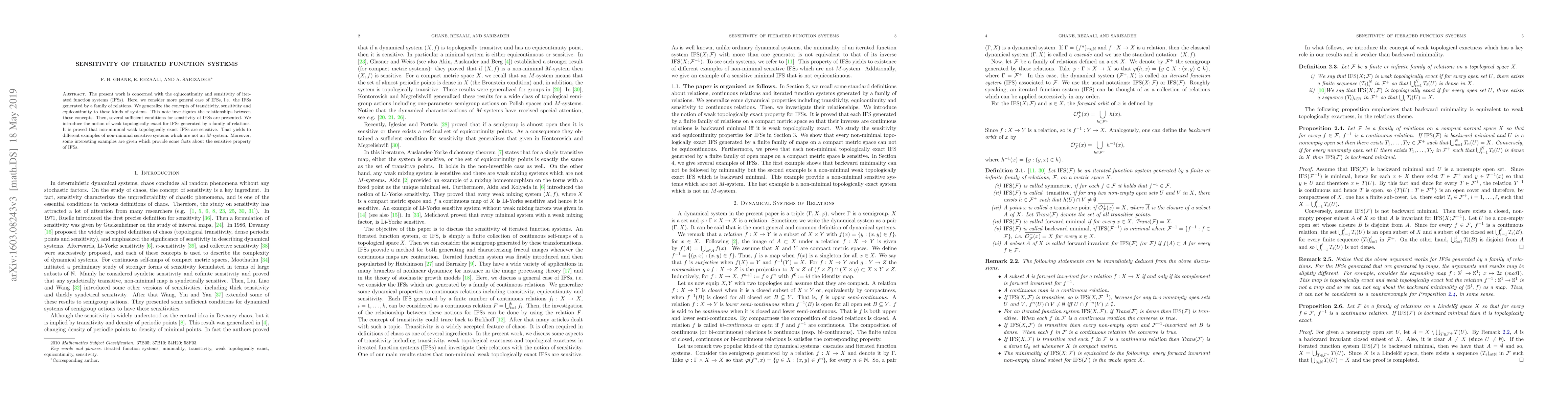 The present work is concerned with the eqiucontinuity and sensitivity of iterated function systems (IFSs). Here, we consider more general case of IFSs, i.e. the IFSs generated by a family of relations. We generalize the concepts of transitivity, sensitivity and equicontinuity to these kinds of systems. This note investigates the relationships between these concepts. Then, several sufficient conditions for sensitivity of IFSs are presented. We introduce the notion of weak topologically exact for IFSs generated by a family of relations. It is proved that non-minimal weak topologically exact IFSs are sensitive. That yields to different examples of non-minimal sensitive systems which are not an M-system. Moreover, some interesting examples are given which provide some facts about the sensitive property of IFSs.