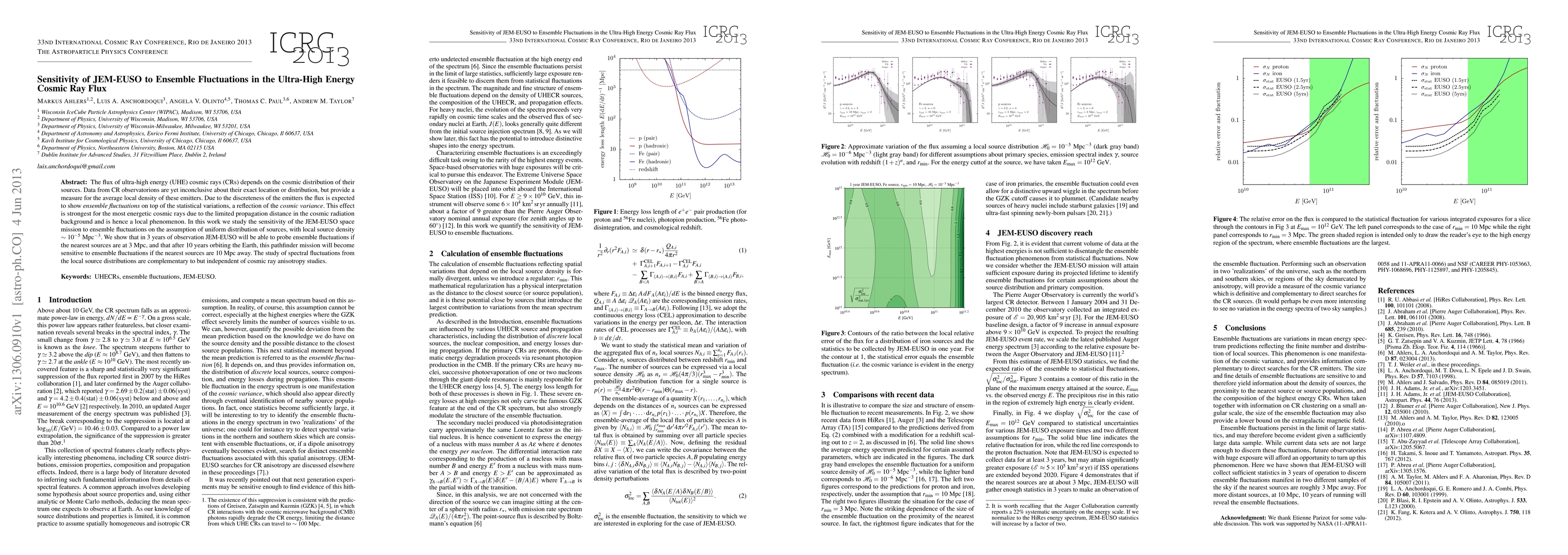 This paper investigates the JEM-EUSO space mission's ability to detect ensemble fluctuations in ultra-high energy cosmic ray flux, assuming a uniform source distribution. It concludes that JEM-EUSO will be able to probe these fluctuations over 3 years if sources are within 3 Mpc, and after 10 years, if sources are within 10 Mpc.