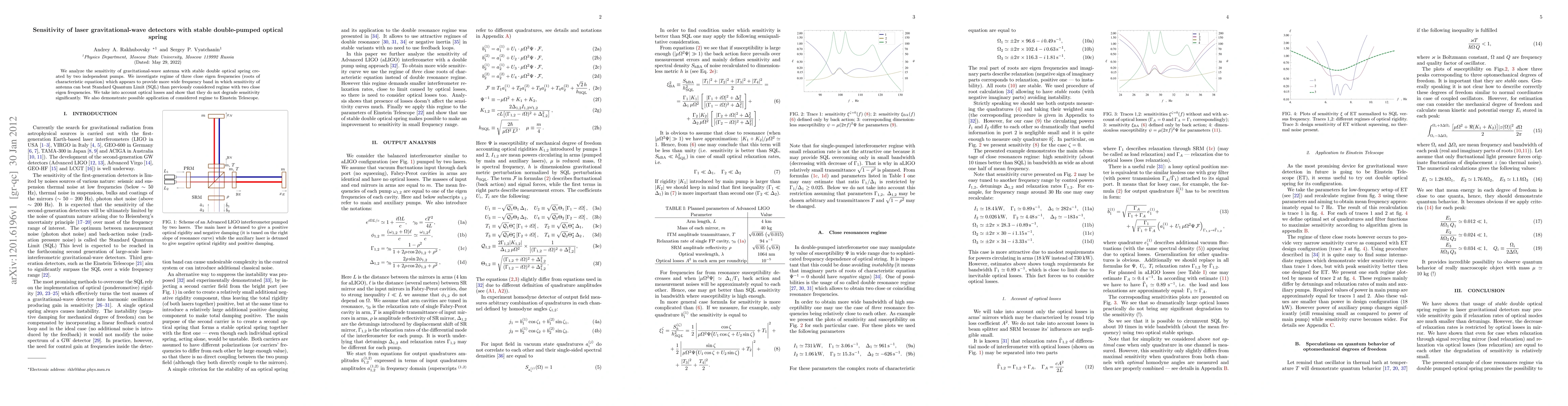 This paper analyzes the sensitivity of laser gravitational-wave detectors using a stable double-pumped optical spring, finding that a regime with three close eigen frequencies enhances the frequency band where sensitivity surpasses the Standard Quantum Limit. Optical losses are shown to have minimal impact on sensitivity, with potential applications for the Einstein Telescope.
