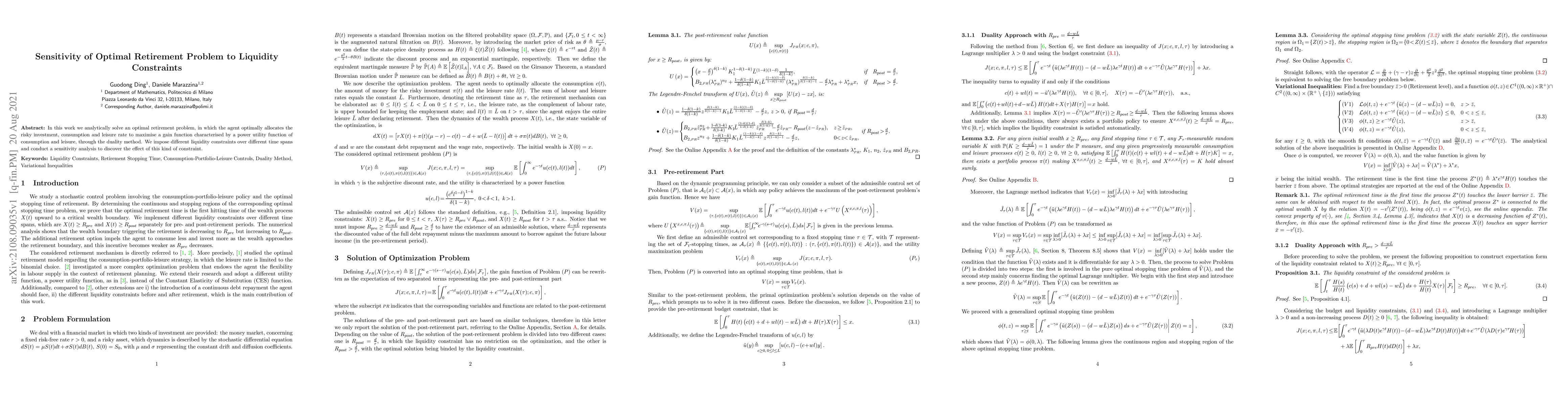 This paper analytically solves an optimal retirement problem using the duality method, focusing on how liquidity constraints over various time spans affect the agent's allocation of risky investments, consumption, and leisure to maximize a utility function. The study reveals the sensitivity of retirement decisions to these constraints.