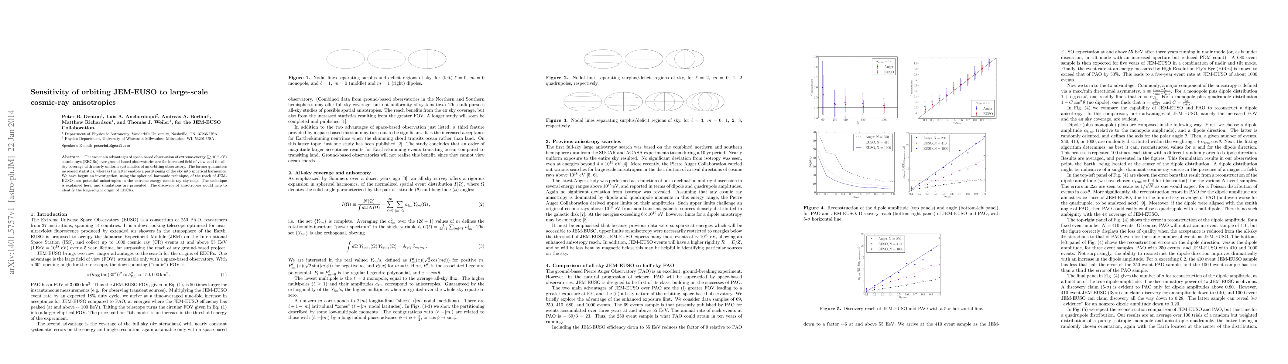 The two main advantages of space-based observation of extreme-energy ($\gtrsim 10^{19}$~eV) cosmic-rays (EECRs) over ground-based observatories are the increased field of view, and the all-sky coverage with nearly uniform systematics of an orbiting observatory. The former guarantees increased statistics, whereas the latter enables a partitioning of the sky into spherical harmonics. We have begun an investigation, using the spherical harmonic technique, of the reach of \J\ into potential anisotropies in the extreme-energy cosmic-ray sky-map. The technique is explained here, and simulations are presented. The discovery of anisotropies would help to identify the long-sought origin of EECRs.