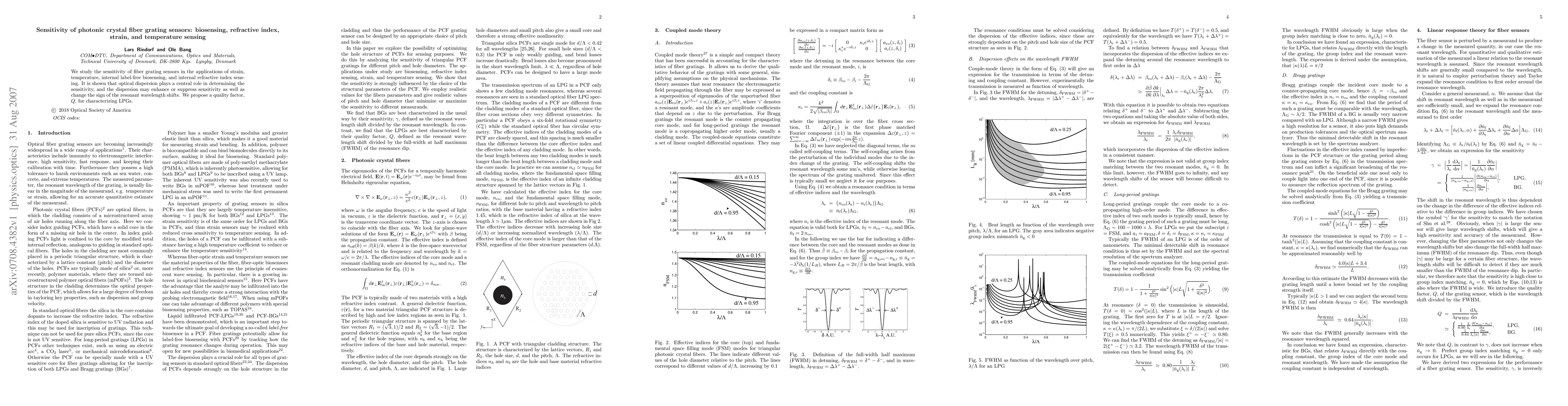 This paper investigates the sensitivity of photonic crystal fiber grating sensors for strain, temperature, biosensing, and refractive index sensing, highlighting the crucial role of optical dispersion in determining sensitivity. A new quality factor, $Q$, is proposed to characterize long period gratings (LPGs).
