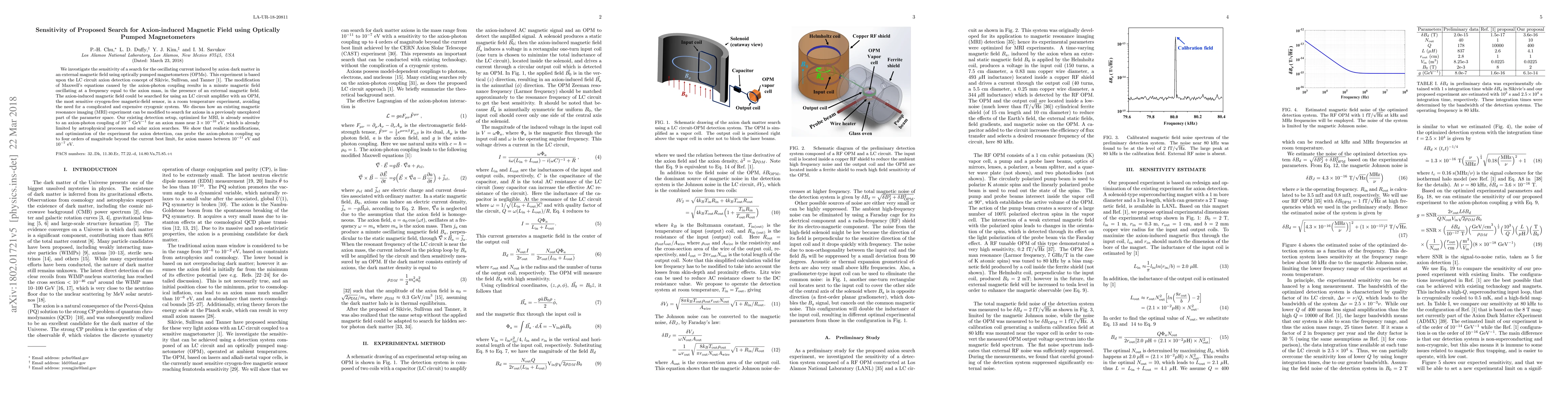 We investigate a search for the oscillating current induced by axion dark matter in an external magnetic field using optically pumped magnetometers (OPMs). This experiment is based upon the LC circuit axion detection concept of Sikivie, Sullivan, and Tanner. The modification of Maxwell's equations caused by the axion-photon coupling results in a minute oscillating magnetic field at the frequency equal to the axion mass in the presence of magnetic field. This induced magnetic field could be searched for using an LC circuit amplifier with an OPM, the most sensitive cryogen-free magnetic-field sensor, in a room temperature experiment, avoiding the need for a complicated and expensive cryogenic system. We discuss how an existing magnetic resonance imaging (MRI) experiment can be modified to search for axions in a previously unexplored part of the parameter space. Our existing detection setup, optimized for MRI, is already sensitive to an axion-photon coupling of $10^{-7}$ GeV$^{-1}$ for an axion mass near $3\times10^{-10}$ eV. While this is ruled out by limits from astrophysics and solar axion searches, we show that realistic modifications, and optimization of the experiment for axion detection, can set a new limit on the axion-photon coupling up to three orders of magnitude beyond the current best limit, for axion masses between $10^{-11}$ eV and $10^{-7}$ eV.ion masses between $10^{-11}$ eV and $10^{-7}$ eV.