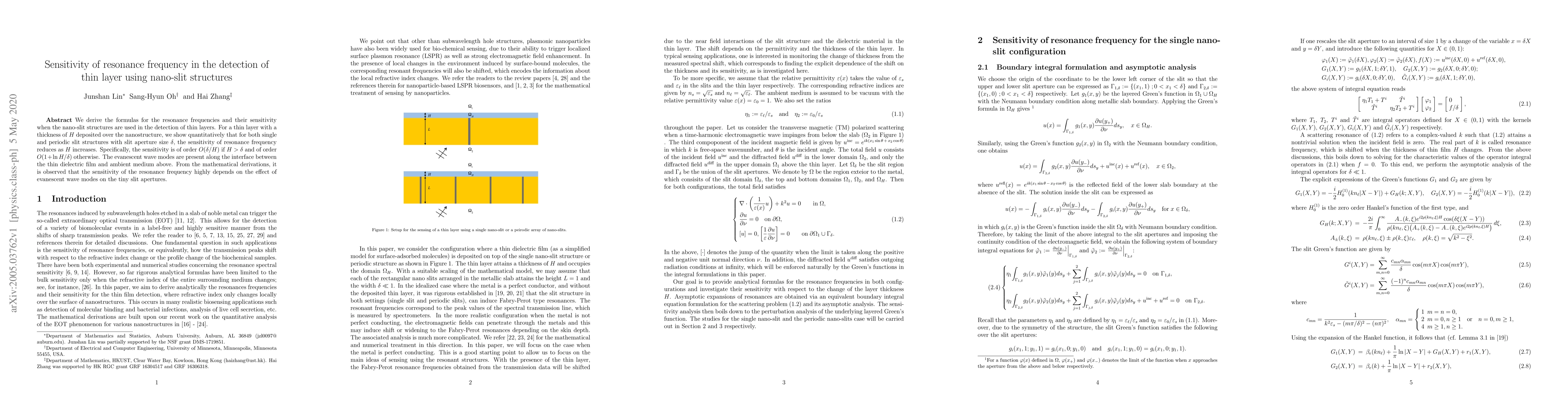 This paper derives formulas for resonance frequencies and their sensitivity in detecting thin layers using nano-slit structures. It finds that the sensitivity decreases as the layer thickness increases, being of order $O(\delta/H)$ when $H > \delta$ and $O(1+\ln H/\delta)$ otherwise, with evanescent wave modes significantly influencing the resonance frequency.