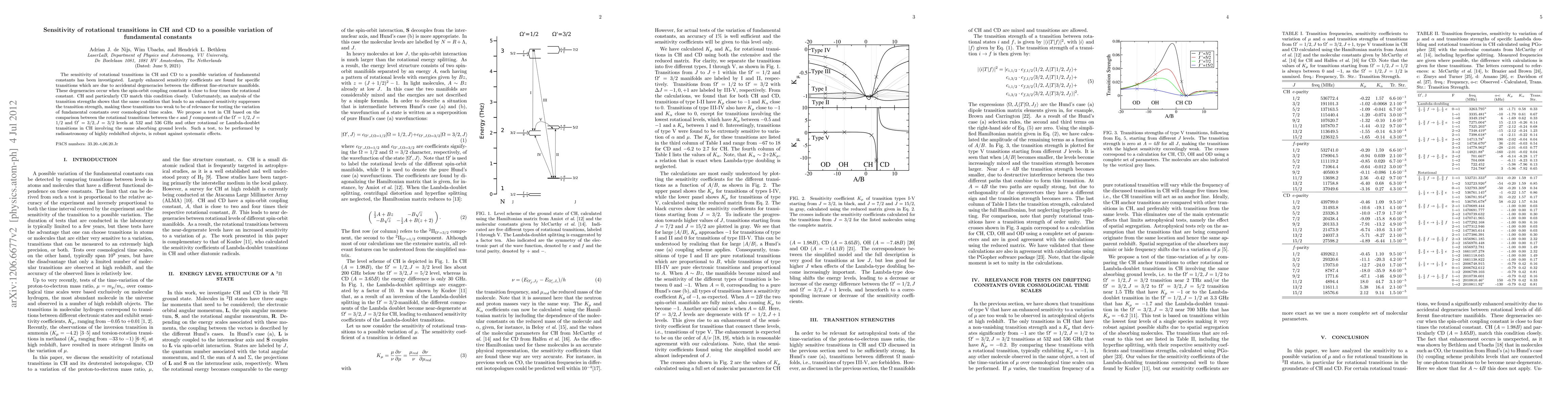 This paper investigates the sensitivity of CH and CD rotational transitions to variations in fundamental constants, finding enhanced sensitivity due to accidental degeneracies. However, these transitions are too weak for cosmological tests, despite proposing a robust radioastronomical test for CH.