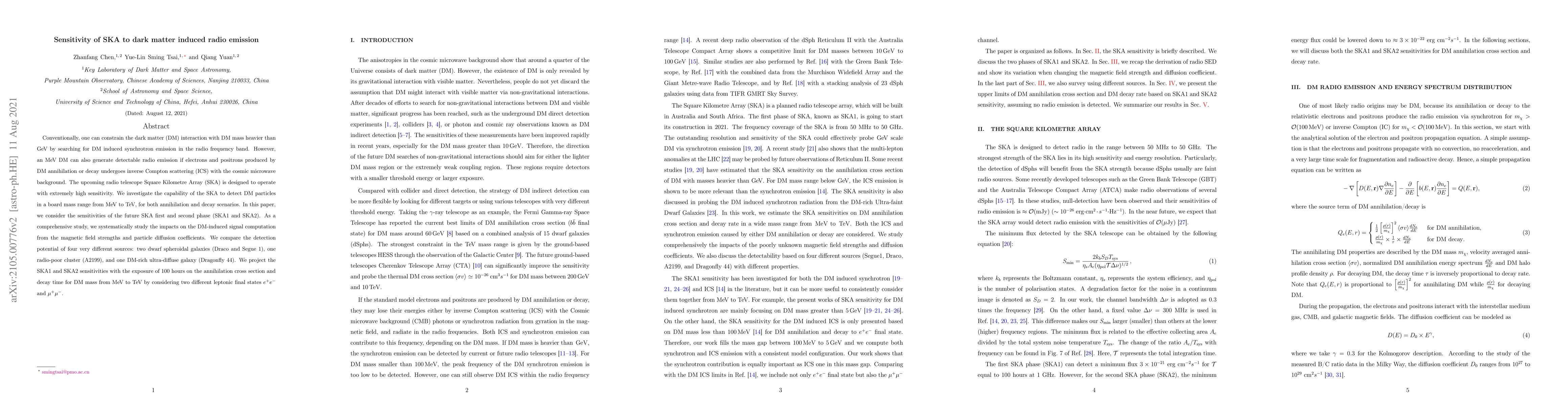 This paper evaluates the Square Kilometre Array's (SKA) capability to detect dark matter (DM) particles through radio emissions, considering DM masses from MeV to TeV. It projects SKA1 and SKA2 sensitivities over 100 hours, comparing four different sources and examining the impact of magnetic fields and particle diffusion on DM-induced signals.