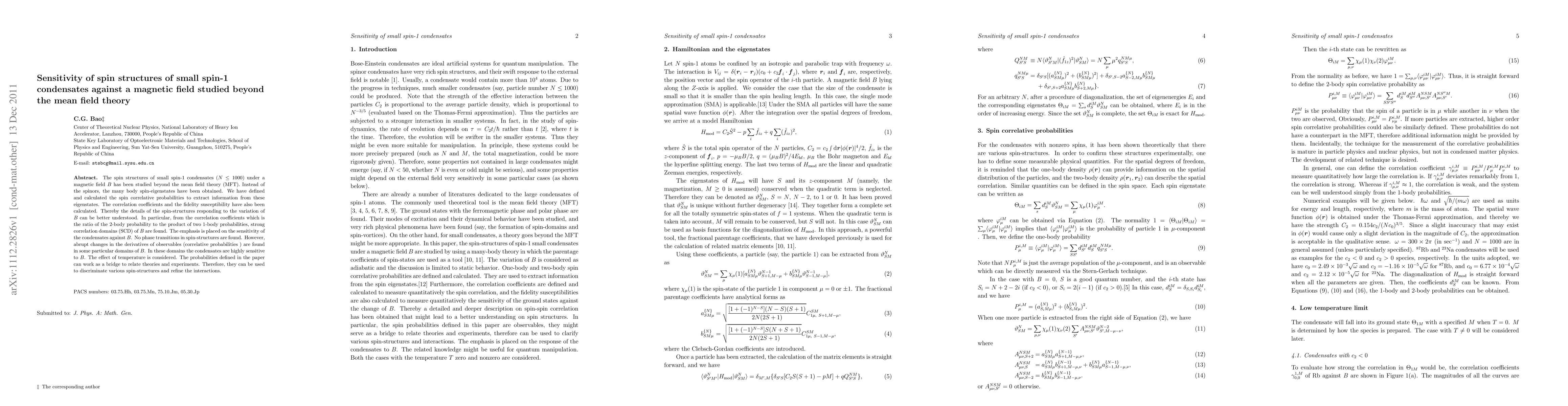 The spin structures of small spin-1 condensates ($N\leq 1000$) under a magnetic field $B$ has been studied beyond the mean field theory (MFT). Instead of the spinors, the many body spin-eigenstates have been obtained. We have defined and calculated the spin correlative probabilities to extract information from these eigenstates. The correlation coefficients and the fidelity susceptibility have also been calculated. Thereby the details of the spin-structures responding to the variation of $B$ can be better understood. In particular, from the correlation coefficients which is the ratio of the 2-body probability to the product of two 1-body probabilities, strong correlation domains (SCD) of $B$ are found. The emphasis is placed on the sensitivity of the condensates against $B$. No phase transitions in spin-structures are found. However, abrupt changes in the derivatives of observables (correlative probabilities) are found in some particular domains of $B$. In these domains the condensates are highly sensitive to $B$. The effect of temperature is considered. The probabilities defined in the paper can work as a bridge to relate theories and experiments. Therefore, they can be used to discriminate various spin-structures and refine the interactions.