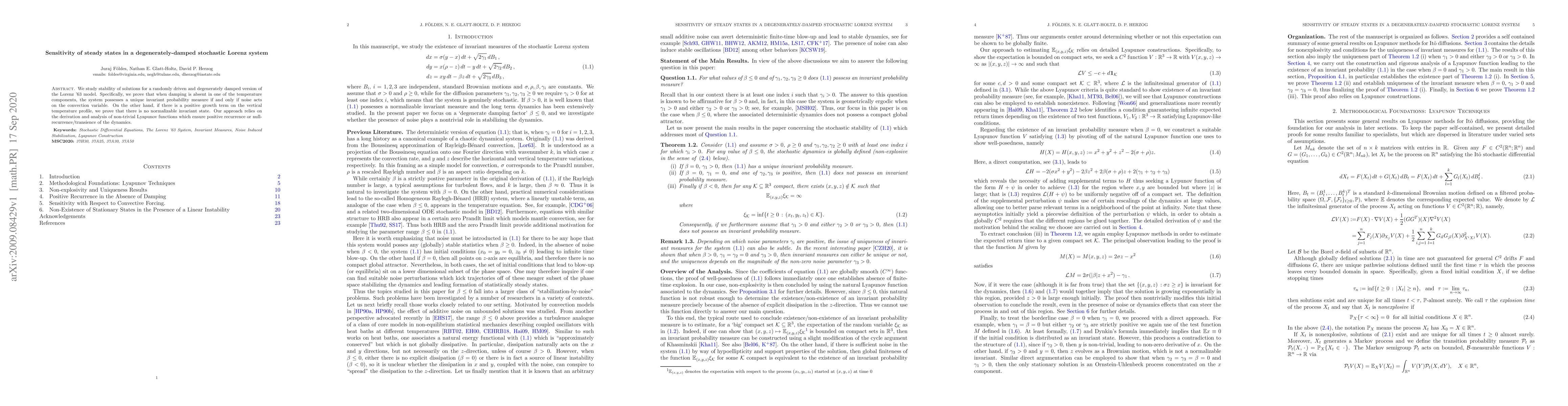We study stability of solutions for a randomly driven and degenerately damped version of the Lorenz '63 model. Specifically, we prove that when damping is absent in one of the temperature components, the system possesses a unique invariant probability measure if and only if noise acts on the convection variable. On the other hand, if there is a positive growth term on the vertical temperature profile, we prove that there is no normalizable invariant state. Our approach relies on the derivation and analysis of non-trivial Lyapunov functions which ensure positive recurrence or null-recurrence/transience of the dynamics.