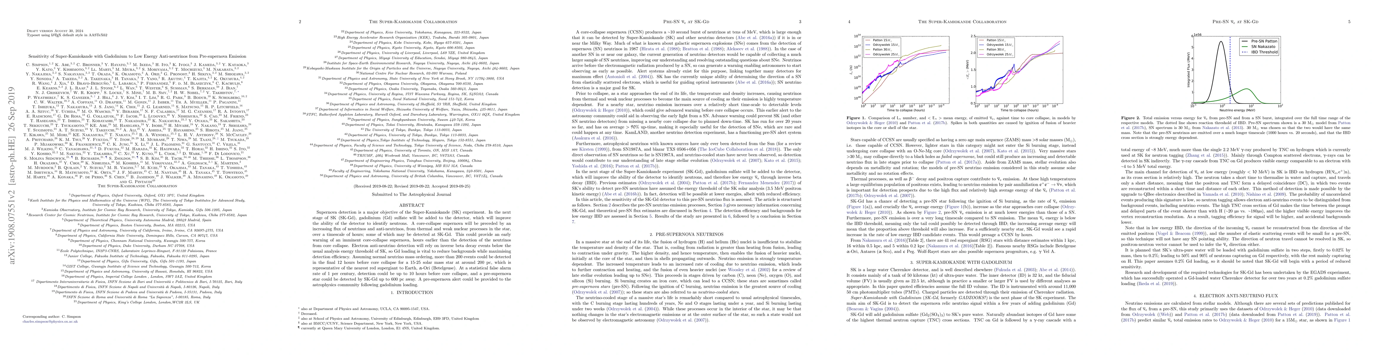The Super-Kamiokande (SK) experiment will enhance its detection of low-energy anti-neutrinos from pre-supernova emissions with the addition of gadolinium sulfate, potentially providing an early warning of core-collapse supernovae up to 10 hours in advance. This improvement could detect over 200 events in the final 12 hours before collapse for stars similar to Betelgeuse, up to 250 light-years away.