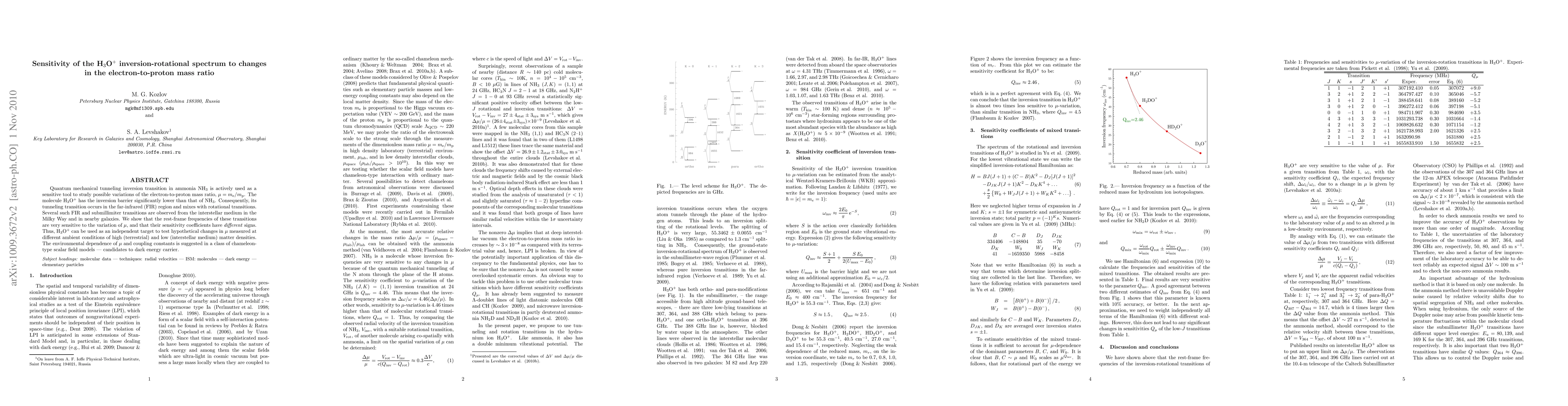 Quantum mechanical tunneling inversion transition in ammonia NH3 is actively used as a sensitive tool to study possible variations of the electron-to-proton mass ratio, mu = m_e/m_p. The molecule H3O+ has the inversion barrier significantly lower than that of NH3. Consequently, its tunneling transition occurs in the far-infrared (FIR) region and mixes with rotational transitions. Several such FIR and submillimiter transitions are observed from the interstellar medium in the Milky Way and in nearby galaxies. We show that the rest-frame frequencies of these transitions are very sensitive to the variation of mu, and that their sensitivity coefficients have different signs. Thus, H3O+ can be used as an independent target to test hypothetical changes in mu measured at different ambient conditions of high (terrestrial) and low (interstellar medium) matter densities. The environmental dependence of mu and coupling constants is suggested in a class of chameleon-type scalar field models - candidates to dark energy carrier.