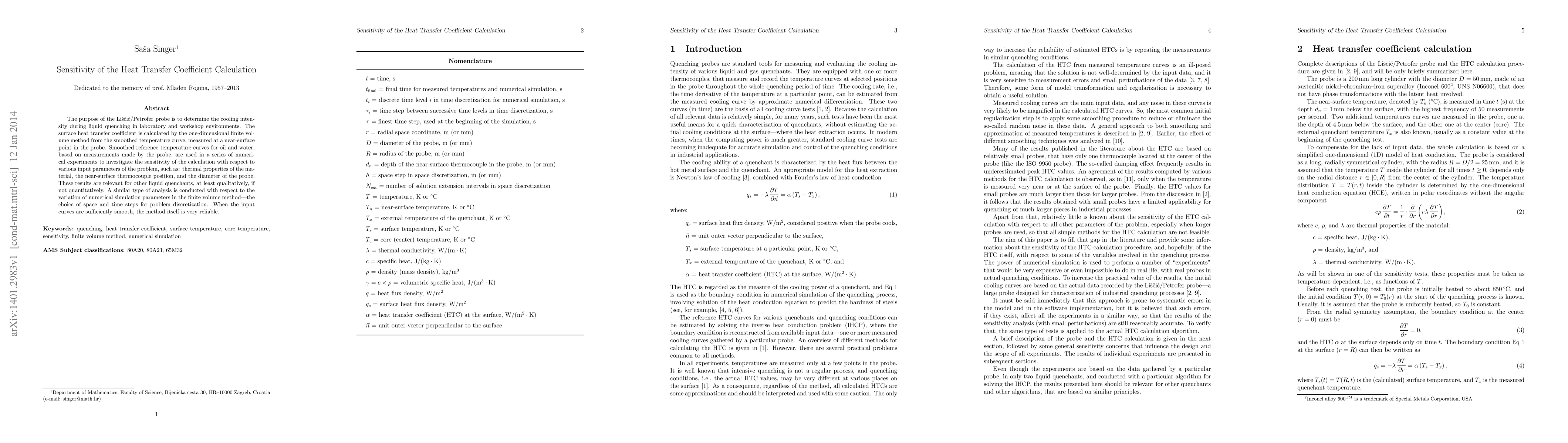 Researchers investigated the sensitivity of heat transfer coefficient calculation in a laboratory probe for liquid quenching, finding that the method is reliable when input curves are smooth and the choice of numerical simulation parameters matters.