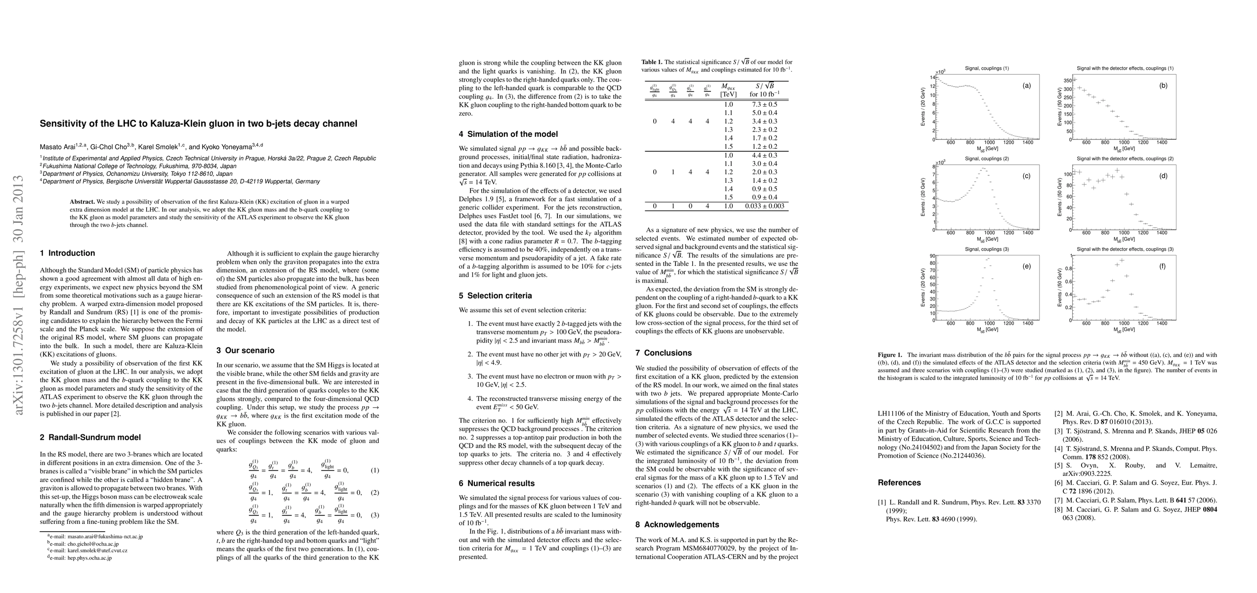 This paper investigates the potential for the ATLAS experiment at the LHC to detect the first Kaluza-Klein excitation of the gluon in a warped extra dimension model, focusing on its decay into two b-jets and analyzing the sensitivity based on the KK gluon mass and its coupling to b-quarks.