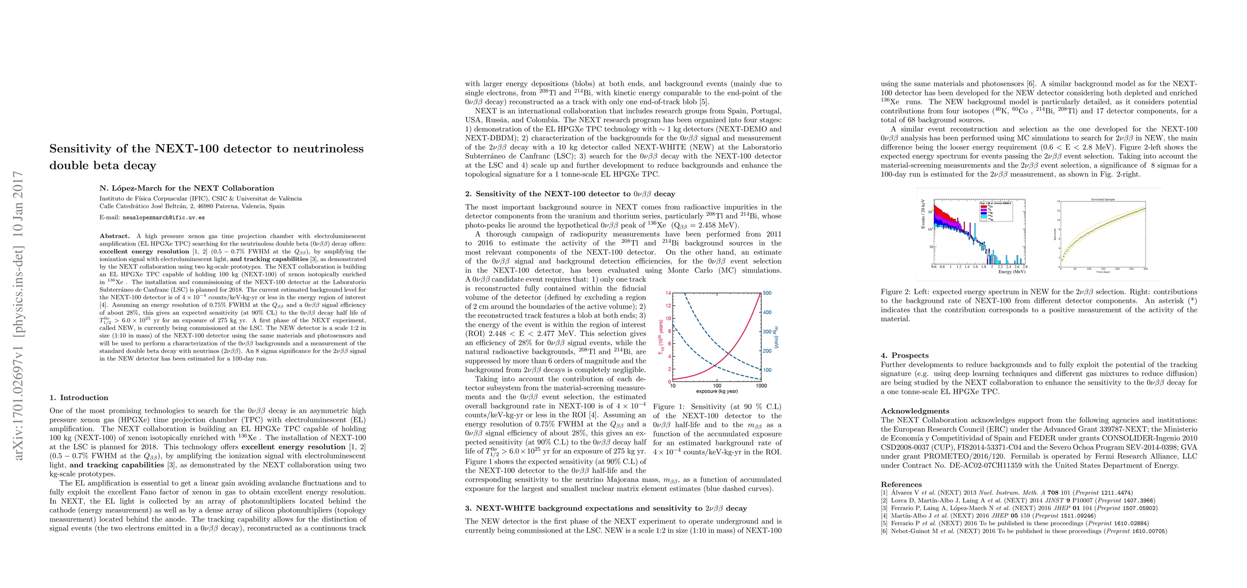 The NEXT-100 detector, a high-pressure xenon gas TPC with electroluminescent amplification, aims to detect neutrinoless double beta decay with high sensitivity and energy resolution. The planned installation at LSC anticipates a background level of $4\times10^{-4}$ counts/keV-kg-yr, offering a half-life sensitivity of $T^{0\nu}_{1/2}>6.0\times10^{25}$ yr.