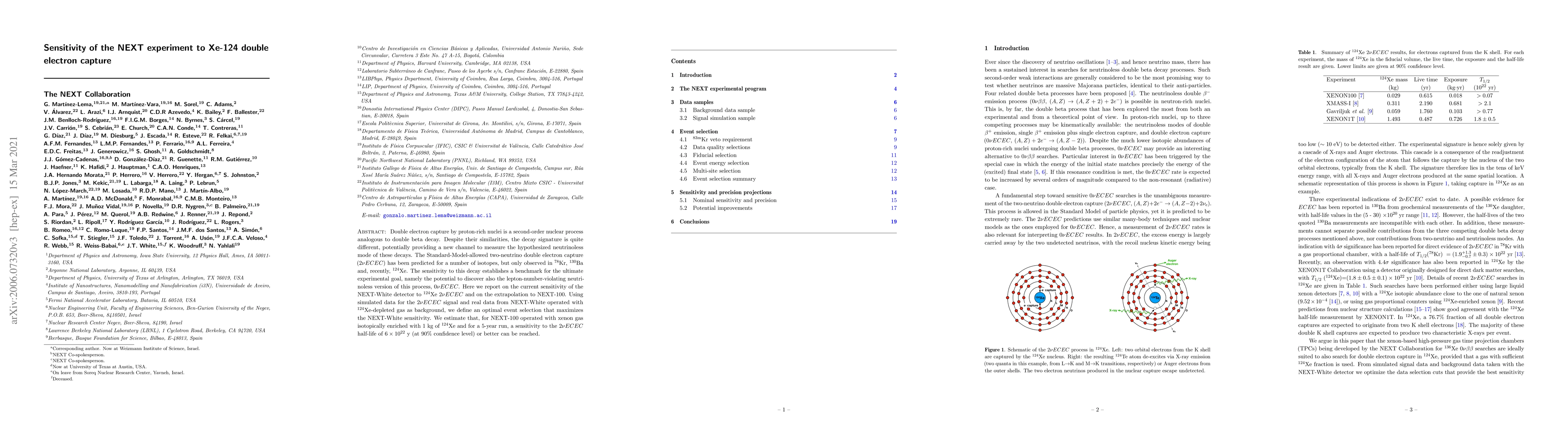Double electron capture by proton-rich nuclei is a second-order nuclear process analogous to double beta decay. Despite their similarities, the decay signature is quite different, potentially providing a new channel to measure the hypothesized neutrinoless mode of these decays. The Standard-Model-allowed two-neutrino double electron capture ($2\nu ECEC$) has been predicted for a number of isotopes, but only observed in $^{78}$Kr, $^{130}$Ba and, recently, $^{124}$Xe. The sensitivity to this decay establishes a benchmark for the ultimate experimental goal, namely the potential to discover also the lepton-number-violating neutrinoless version of this process, $0\nu ECEC$. Here we report on the current sensitivity of the NEXT-White detector to $^{124}$Xe $2\nu ECEC$ and on the extrapolation to NEXT-100. Using simulated data for the $2\nu ECEC$ signal and real data from NEXT-White operated with $^{124}$Xe-depleted gas as background, we define an optimal event selection that maximizes the NEXT-White sensitivity. We estimate that, for NEXT-100 operated with xenon gas isotopically enriched with 1 kg of $^{124}$Xe and for a 5-year run, a sensitivity to the $2\nu ECEC$ half-life of $6 \times 10^{22}$ y (at 90% confidence level) or better can be reached.