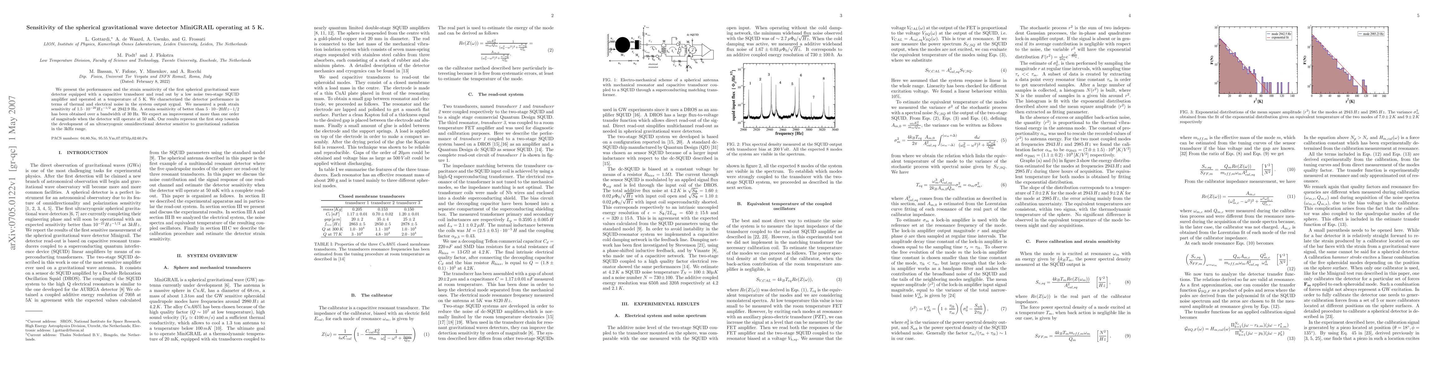 We present the performances and the strain sensitivity of the first spherical gravitational wave detector equipped with a capacitive transducer and read out by a low noise two-stage SQUID amplifier and operated at a temperature of 5 K. We characterized the detector performance in terms of thermal and electrical noise in the system output sygnal. We measured a peak strain sensitivity of $1.5\cdot 10^{-20} Hz^{-1/2}$ at 2942.9 Hz. A strain sensitivity of better than $5\cdot 10{-20}Hz{-1/2}$ has been obtained over a bandwidth of 30 Hz. We expect an improvement of more than one order of magnitude when the detector will operate at 50 mK. Our results represent the first step towards the development of an ultracryogenic omnidirectional detector sensitive to gravitational radiation in the 3kHz range.