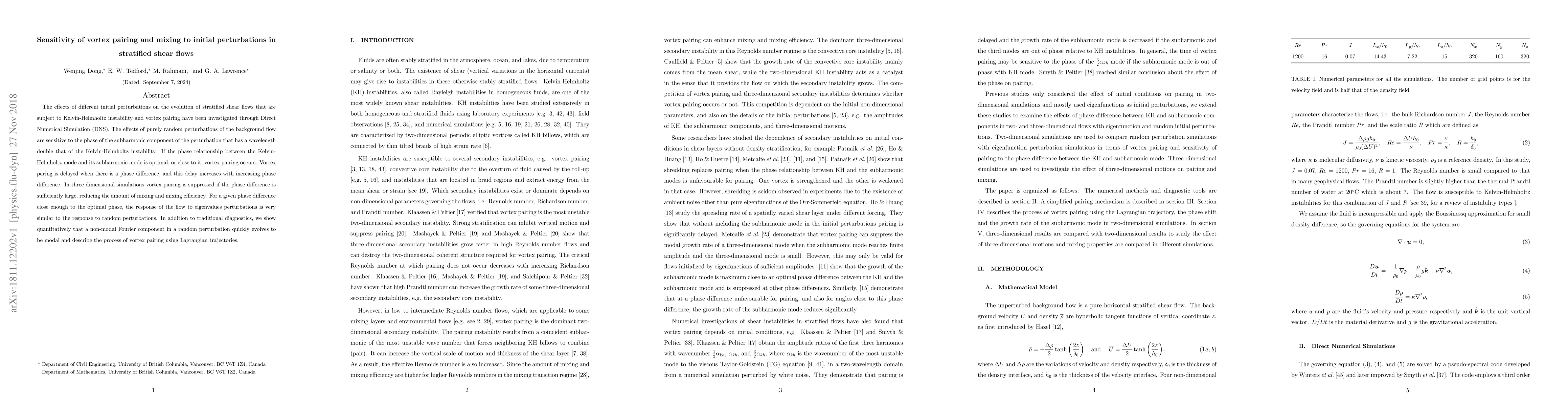 The effects of different initial perturbations on the evolution of stratified shear flows that are subject to Kelvin-Helmholtz instability and vortex pairing have been investigated through Direct Numerical Simulation (DNS). The effects of purely random perturbations of the background flow are sensitive to the phase of the subharmonic component of the perturbation that has a wavelength double that of the Kelvin-Helmholtz instability. If the phase relationship between the Kelvin-Helmholtz mode and its subharmonic mode is optimal, or close to it, vortex pairing occurs. Vortex paring is delayed when there is a phase difference, and this delay increases with increasing phase difference. In three dimensional simulations vortex pairing is suppressed if the phase difference is sufficiently large, reducing the amount of mixing and mixing efficiency. For a given phase difference close enough to the optimal phase, the response of the flow to eigenvalues perturbations is very similar to the response to random perturbations. In addition to traditional diagnostics, we show quantitatively that a non-modal Fourier component in a random perturbation quickly evolves to be modal and describe the process of vortex pairing using Lagrangian trajectories.