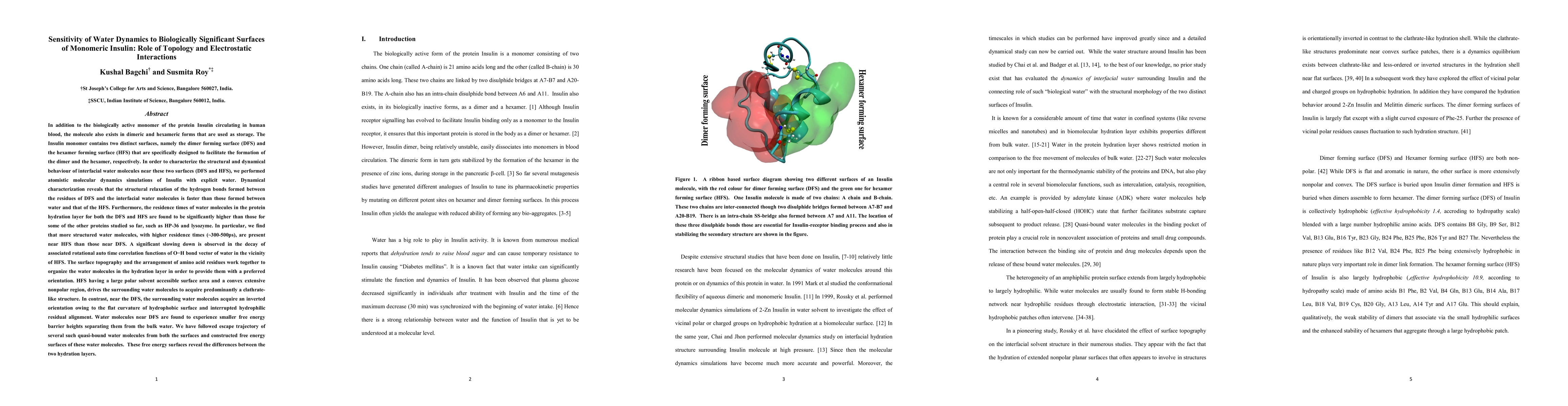 In addition to the biologically active monomer of the protein Insulin circulating in human blood, the molecule also exists in dimeric and hexameric forms that are used as storage. The Insulin monomer contains two distinct surfaces, namely the dimer forming surface (DFS) and the hexamer forming surface (HFS) that are specifically designed to facilitate the formation of the dimer and the hexamer, respectively. In order to characterize the structural and dynamical behaviour of interfacial water molecules near these two surfaces (DFS and HFS), we performed atomistic molecular dynamics simulations of Insulin with explicit water. Dynamical characterization reveals that the structural relaxation of the hydrogen bonds formed between the residues of DFS and the interfacial water molecules is faster than those formed between water and that of the HFS. Furthermore, the residence times of water molecules in the protein hydration layer for both the DFS and HFS are found to be significantly higher than those for some of the other proteins studied so far, such as HP-36 and lysozyme. The surface topography and the arrangement of amino acid residues work together to organize the water molecules in the hydration layer in order to provide them with a preferred orientation. HFS having a large polar solvent accessible surface area and a convex extensive nonpolar region, drives the surrounding water molecules to acquire predominantly a clathrate-like structure. In contrast, near the DFS, the surrounding water molecules acquire an inverted orientation owing to the flat curvature of hydrophobic surface and interrupted hydrophilic residual alignment. We have followed escape trajectory of several such quasi-bound water molecules from both the surfaces and constructed free energy surfaces of these water molecules.These free energy surfaces reveal the differences between the two hydration layers.