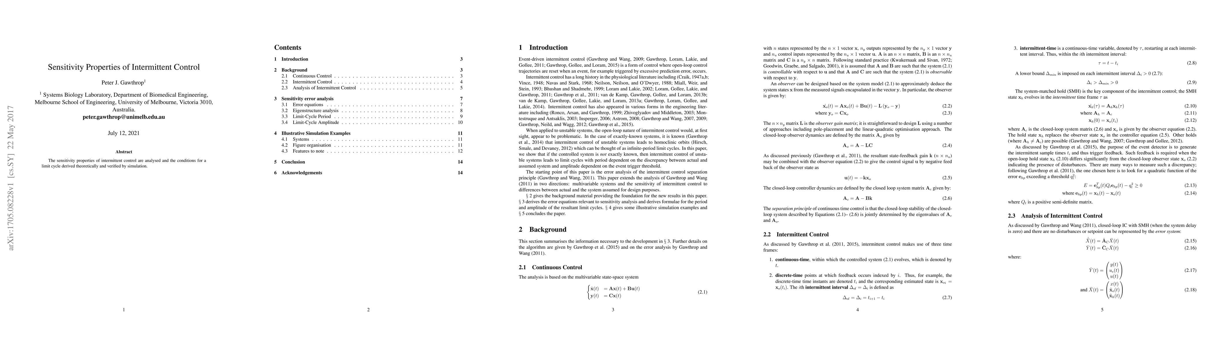 The sensitivity properties of intermittent control are analysed and the conditions for a limit cycle derived theoretically and verified by simulation.