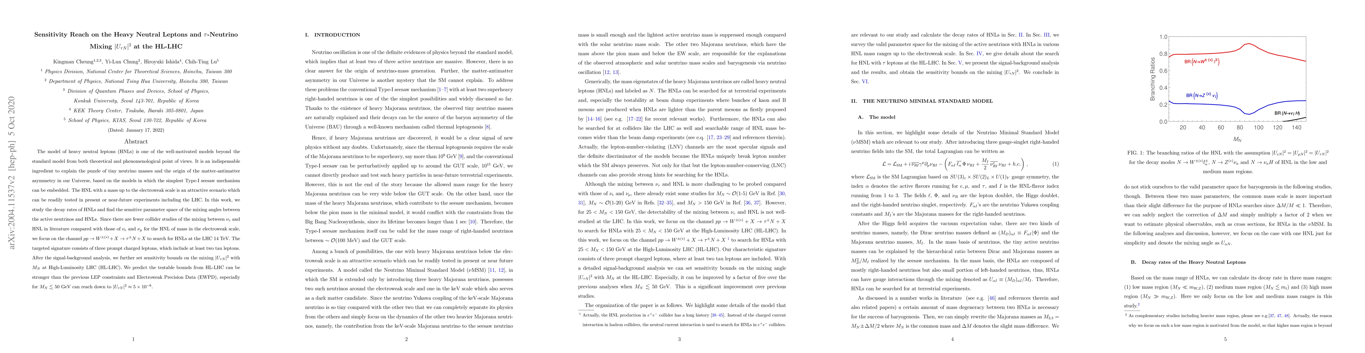 The model of heavy neutral leptons (HNLs) is one of the well-motivated models beyond the standard model (BSM) from both theoretical and phenomenological point of views. It is an indispensable ingredient to explain the puzzle of tiny neutrino masses and the origin of the matter-antimatter asymmetry in our Universe, based on the models in which the simplest Type-I seesaw mechanism can be embedded. The HNL with a mass up to the electroweak scale is an attractive scenario which can be readily tested in present or near-future experiments including the LHC. In this work, we study the decay rates of HNLs and find the sensitive parameter space of the mixing angles between the active neutrinos and HNLs. Since the mixing between $ \nu_{\tau} $ and HNL is not well established in literature compared with those of $\nu_e$ and $\nu_{\mu}$ for the HNL of mass in the electroweak scale, we focus on the channel $ pp\rightarrow W^{\pm(\ast)} + X\rightarrow \tau^{\pm} N + X$ to search for HNLs at the LHC 14 TeV. The targeted signature consists of three prompt charged leptons, which include at least two tau leptons. After the signal-background analysis, we further set sensitivity bounds on the mixing $ |U_{\tau N}|^2 $ with $ M_N $ at High-Luminosity LHC (HL-LHC). We predict the testable bounds from HL-LHC can be stronger than the previous LEP constraints and Electroweak Precision Data (EWPD), especially for $ M_N \lesssim $ 50 GeV can reach down to $ |U_{\tau N}|^2 \approx 2\times 10^{-6} $.