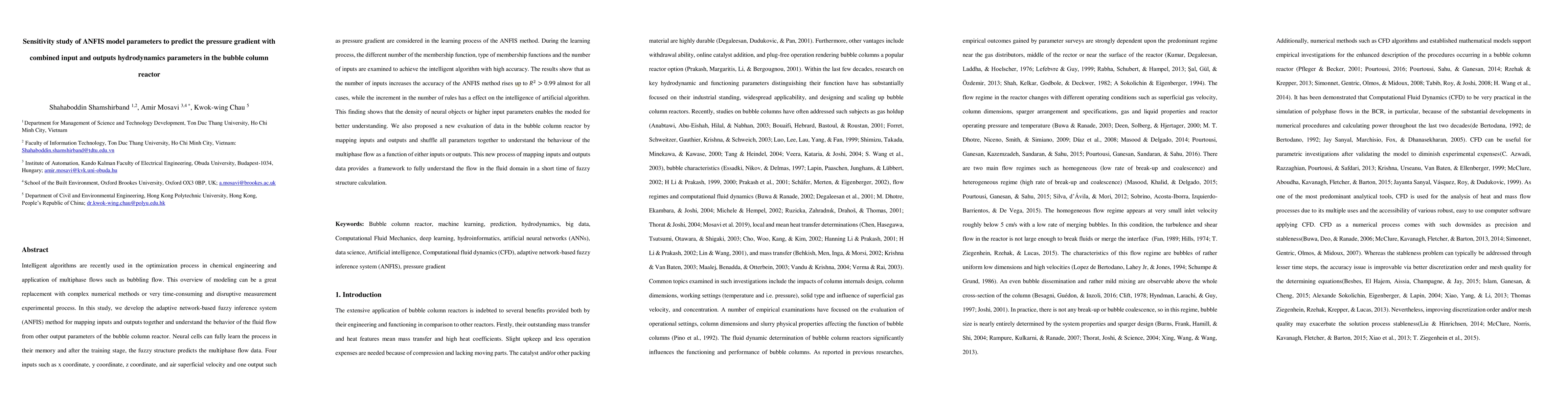 Intelligent algorithms are recently used in the optimization process in chemical engineering and application of multiphase flows such as bubbling flow. This overview of modeling can be a great replacement with complex numerical methods or very time-consuming and disruptive measurement experimental process. In this study, we develop the adaptive network-based fuzzy inference system (ANFIS) method for mapping inputs and outputs together and understand the behavior of the fluid flow from other output parameters of the bubble column reactor. Neural cells can fully learn the process in their memory and after the training stage, the fuzzy structure predicts the multiphase flow data. Four inputs such as x coordinate, y coordinate, z coordinate, and air superficial velocity and one output such as pressure gradient are considered in the learning process of the ANFIS method. During the learning process, the different number of the membership function, type of membership functions and the number of inputs are examined to achieve the intelligent algorithm with high accuracy. The results show that as the number of inputs increases the accuracy of the ANFIS method rises up to R^2>0.99 almost for all cases, while the increment in the number of rules has a effect on the intelligence of artificial algorithm. This finding shows that the density of neural objects or higher input parameters enables the moded for better understanding. We also proposed a new evaluation of data in the bubble column reactor by mapping inputs and outputs and shuffle all parameters together to understand the behaviour of the multiphase flow as a function of either inputs or outputs. This new process of mapping inputs and outputs data provides a framework to fully understand the flow in the fluid domain in a short time of fuzzy structure calculation.